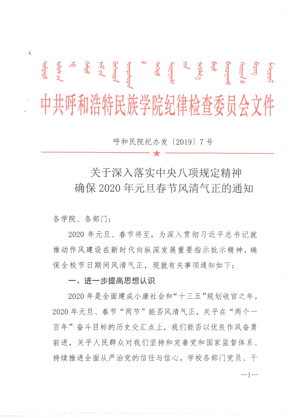 關于深入落實中央八項規定精神確保2020年元旦春節風清氣正的通知