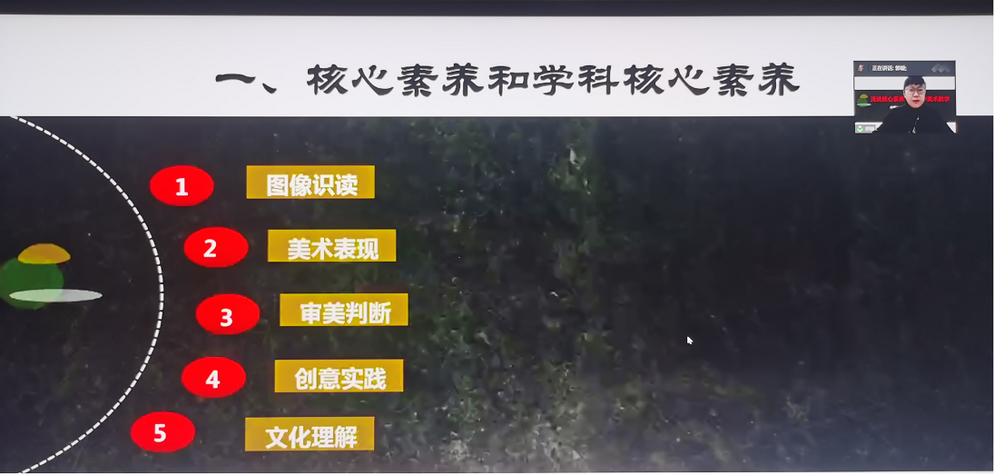 郭璇老師以《淺談核心素養下的高中美術教學》為題,從中學美術學科素養、深度學習、個人教學設計和新課標下美術教師的角色定位等四個方面,結合自己多年的教學經驗和教學成果,重點講解了如何通過美術課教學提升學生核心素養,如何激發學生的學習內驅力,高中美術課設計以及結合案例如何塑造美術教師素養等方面的內容。