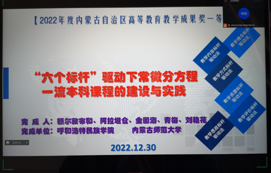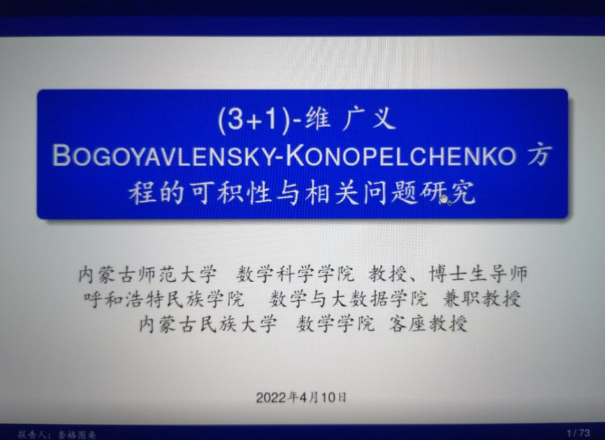 上午,由何吉?dú)g教授和套格圖桑教授分別作了 “數(shù)學(xué)思維與科學(xué)前沿”和“(3+1)維廣義Bogoyavlensky- Konopelchenko方程的可積性與相關(guān)問題研究”為主題的專題報(bào)告,額爾敦布和教授主持。下午,首先額爾敦布和教授圍繞獲得的2022年內(nèi)蒙古自治區(qū)高等教育教學(xué)成果一等獎(jiǎng)成果,作了“‘六個(gè)標(biāo)桿’驅(qū)動(dòng)下常微分方程一流本科課程的建設(shè)與實(shí)踐”為題目的報(bào)告;然后,劉杰副教授、董鵬飛博士、劉愛春博士和何斯日古楞副教授依次作了學(xué)術(shù)報(bào)告,涉及Hamilton算子的生成半群?jiǎn)栴}、Al14Mn2N16力學(xué)性質(zhì)與磁學(xué)性質(zhì)、算子矩陣譜理論和混合有限元法等多方面內(nèi)容。本次論壇內(nèi)容豐富,覆蓋面廣泛,教師們交流充分,相互啟發(fā),為下一步作教學(xué)研究和科學(xué)研究打下了良好的基礎(chǔ)。