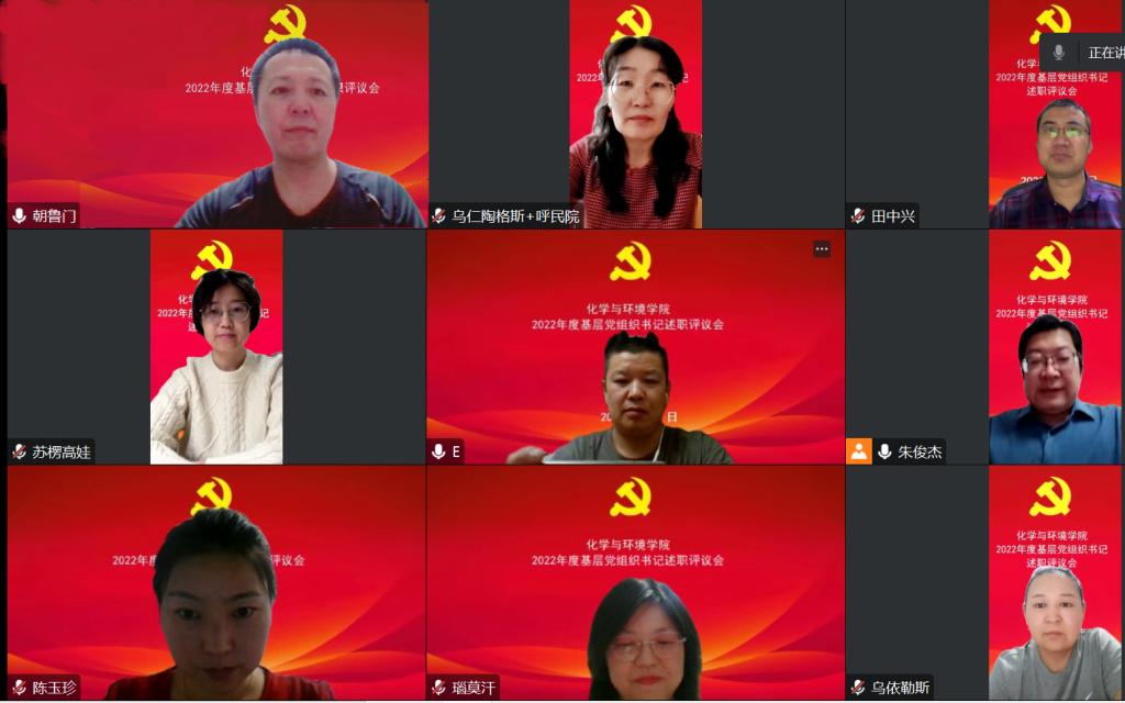 按照學校《關于開展2022年度基層黨組織書記抓黨建述職評議考核工作的預通知》的要求,化學與環境學院總支于2023年2月1日通過線上會議形式召開了化學與環境學院黨總支2022年度基層黨組織書記述職評議會議,學院黨總支委員、各黨支部書記及師生代表參加會議。會議由化學與環境學院黨總支書記朱俊杰主持。