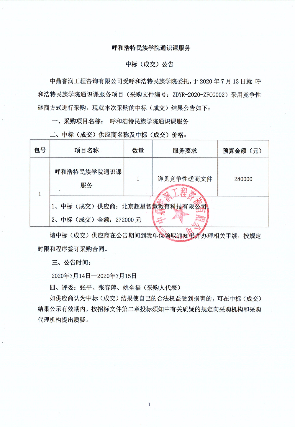 呼和浩特民族學(xué)院通識課服務(wù)中標(biāo)(成交)公告