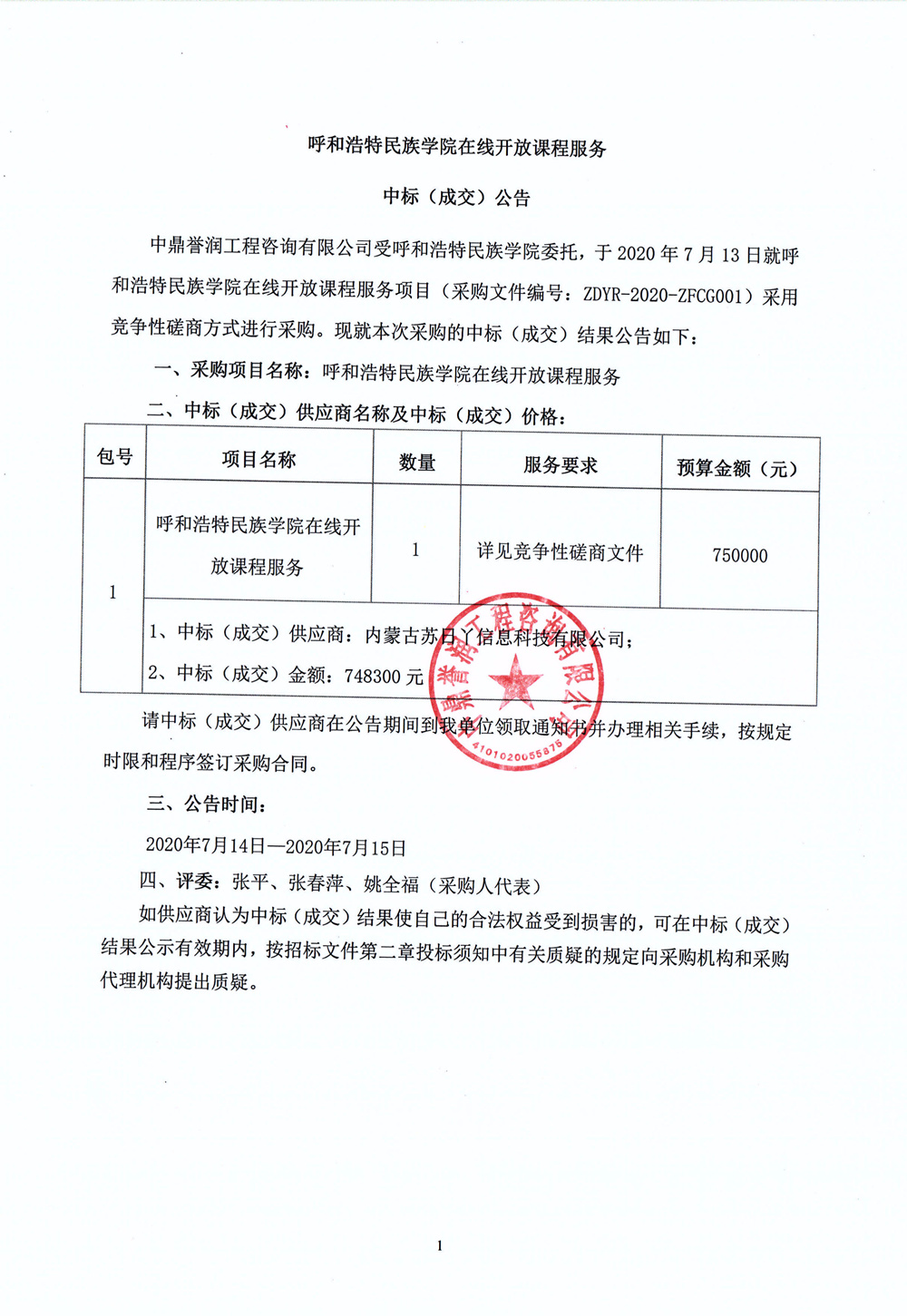 呼和浩特民族學院在線開放課程服務中標(成交)公告