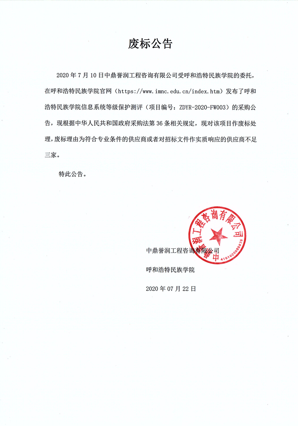 呼和浩特民族學院信息系統等級保護測評項目廢標公告