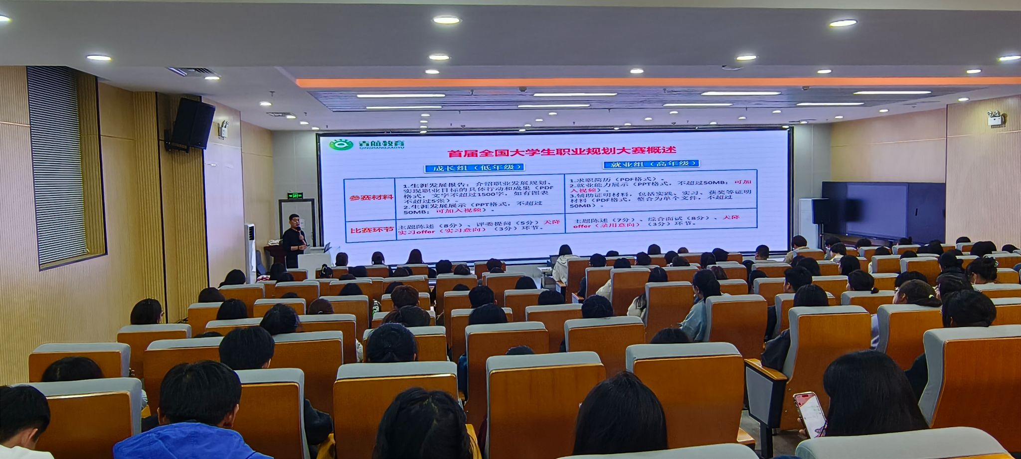 為幫助學生更好地認識自我、探索自我,引導學生樹立正確的成才觀、就業觀和擇業觀,科學合理規劃學業與職業發展,提升職業生涯規劃能力,增強就業競爭力,以及做好教育部首屆全國大學生職業規劃大賽備賽指導,10月30日晚,學校在圖書館一樓報告廳舉辦大學生職業生涯規劃專題講座。大一至大三年級學生共150人參加講座。