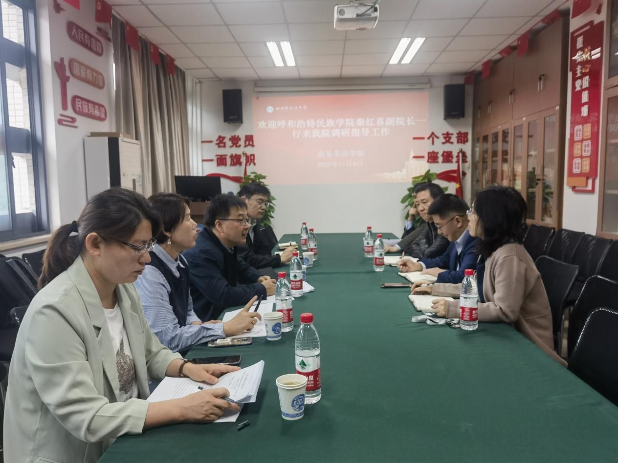 座談會上,胡文飛對秦紅喜一行的到訪表示熱烈歡迎,并簡單介紹了學院的基本情況。秦紅喜對胡文飛的熱情接待表示感謝,并從學院歷史沿革、專業設置、教育教學等方面介紹了我院發展的基本現狀。隨后,董曼霞、郭赫男分別就商務英語學院、新聞傳播學院專業課程設置、學科建設、專業轉型經驗等進行了詳細介紹。紅梅和常慧明就學生就業指導、黨建工作進行了深入交流。