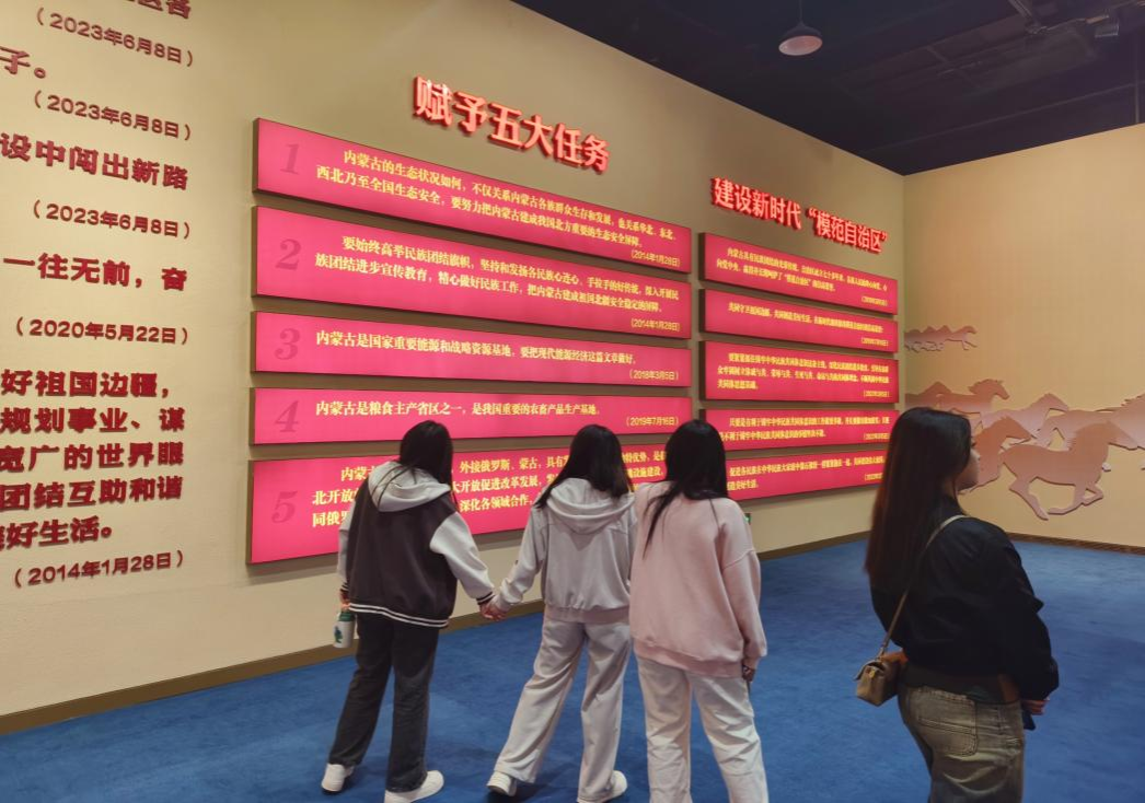 本次展覽以“牢記囑托 感恩奮進——辦好兩件大事 奮力書寫中國式現代化內蒙古新篇章”為主題,通過觀看圖片、文字和實物展品、數字多媒體及沙盤等形式,使同學們更加直觀領會了五大任務和全方位建設“模范自治區”的深刻內涵以及《關于推動內蒙古高質量發展奮力書寫中國式現代化新篇章的意見》的重大部署要求,更加深切體悟了習近平總書記對內蒙古的深情關懷和厚愛期許,進一步凝聚了“感黨恩、聽黨話、跟黨走”奮進合力。