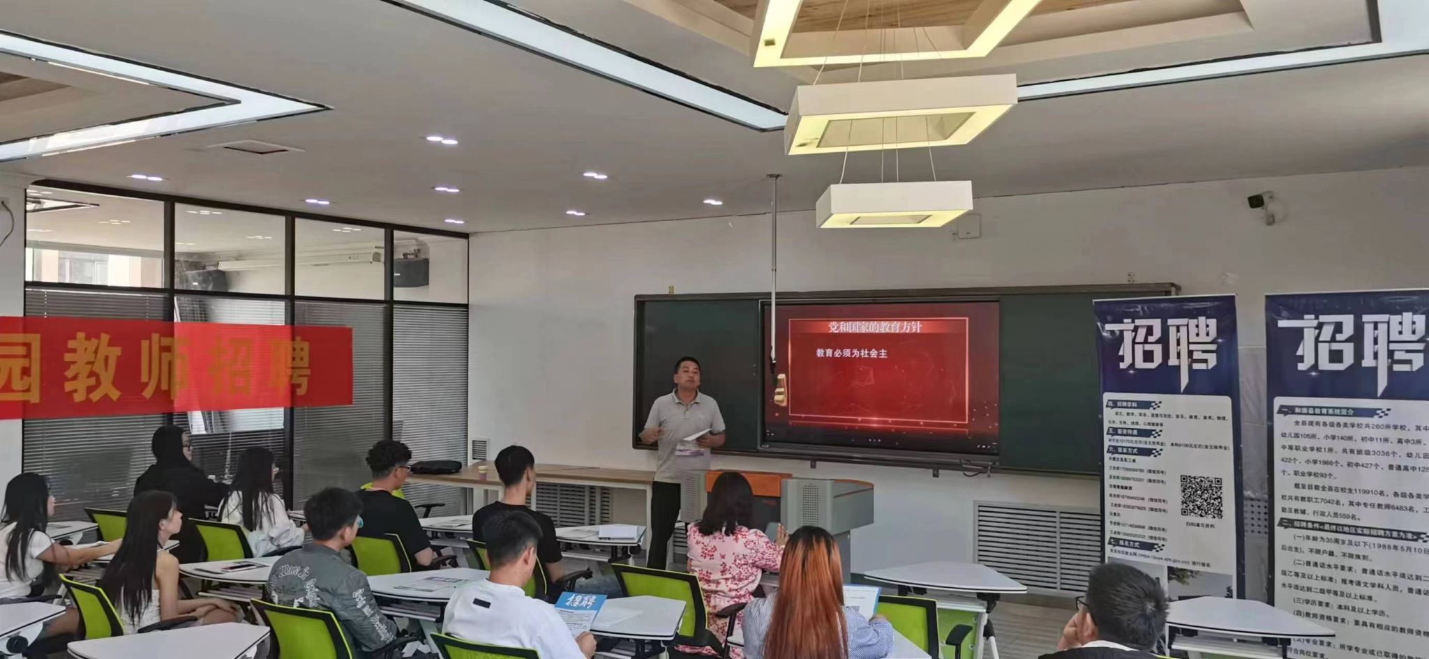 宣講會(huì)上,和田縣教育局招聘負(fù)責(zé)人播放了《和田縣教育系統(tǒng)招聘宣傳片》,并介紹和田縣教育局本次招聘教師報(bào)考流程、招聘條件、招聘學(xué)段、工作環(huán)境、住宿環(huán)境及薪資待遇。最后,和田教育局招聘負(fù)責(zé)人就學(xué)生關(guān)心的交通、福利待遇、職稱(chēng)評(píng)定、在職深造等問(wèn)題與單位進(jìn)行答疑解惑。