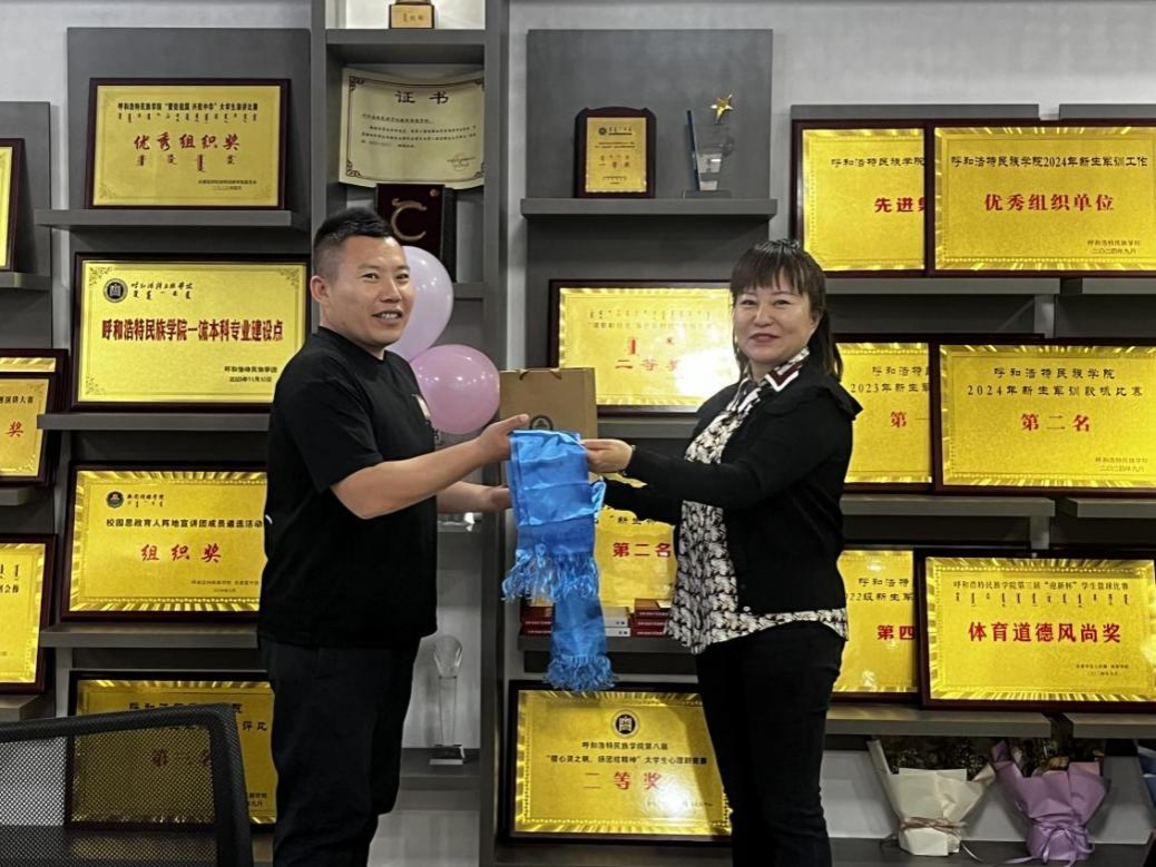 隨后,學院黨總支書記蘇倫高娃、額爾敦畢力格為白塔娜頒發紀念獎章,表達對白塔娜的崇高敬意和誠摯祝福。