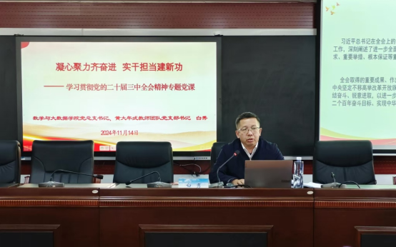 白秀從黨的二十屆三中全會的重大意義和主題、深入學(xué)習(xí)領(lǐng)會習(xí)近平總書記在黨的二十屆三中全會上的重要講話精神、全面準確理解《中共中央關(guān)于進一步全面深化改革、推進中國式現(xiàn)代化的決定》提出的進一步全面深化改革重大舉措、學(xué)習(xí)貫徹自治區(qū)黨委十一屆八次全會精神等4個方面,結(jié)合數(shù)學(xué)與大數(shù)據(jù)學(xué)院實際,對黨的二十屆三中全會精神進行了學(xué)習(xí)宣講。