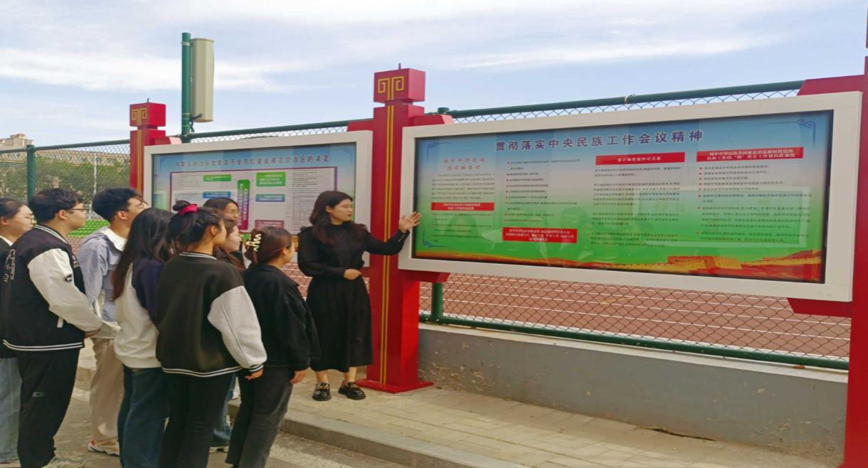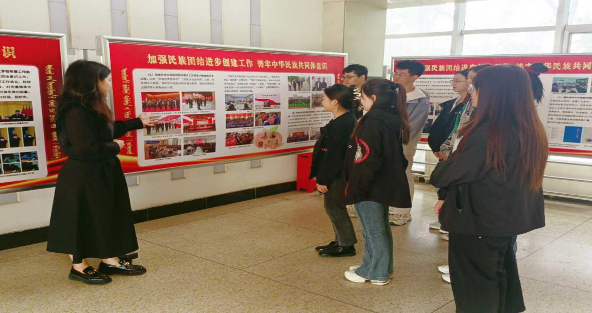 在學(xué)校鑄牢中華民族共同體意識(shí)基地內(nèi),關(guān)欣冉老師詳細(xì)為學(xué)生講述了鑄牢中華民族共同體意識(shí)提出的背景及發(fā)展、各民族團(tuán)結(jié)奮斗、共同發(fā)展的生動(dòng)歷史、習(xí)近平總書記關(guān)于鑄牢中華民族共同體意識(shí)的重要論述等內(nèi)容。同學(xué)們駐足觀看、切身感受民族團(tuán)結(jié)進(jìn)步事業(yè)的豐碩成果,深刻認(rèn)識(shí)和把握“兩個(gè)結(jié)合”與鑄牢中華民族共同體意識(shí)的關(guān)系。