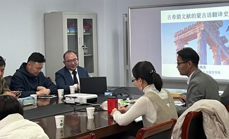本場講座中,包海巖博士以“古希臘文獻的蒙古語翻譯史回顧”為題,從文獻學、語言學的角度分析了我國歷史上的民族交往交流在世界范疇的發展,充分論述了文獻資料與民族交往史研究的重要性。