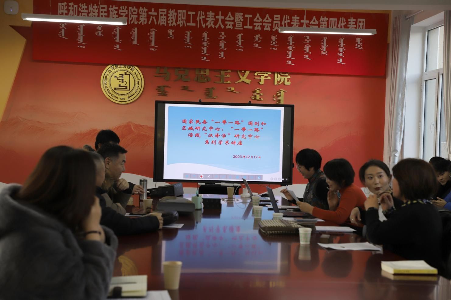 為提升我校教師專業(yè)素養(yǎng)和教研水平,打造專業(yè)化的高質(zhì)量教師隊伍,在建校70周年之際,馬克思主義學(xué)院于12月17日在崇正樓217會議室舉辦國家民委“一帶一路”國別和區(qū)域研究中心——“一帶一路”沿線“漢譯學(xué)”研究中心系列學(xué)術(shù)講座活動。本次講座由馬克思主義學(xué)院香蓮老師主持,內(nèi)蒙古財經(jīng)大學(xué)斯琴巴圖老師、吉林師范大學(xué)蘇日古格博士,馬克思主義學(xué)院和民族學(xué)學(xué)院部分師生參加。
