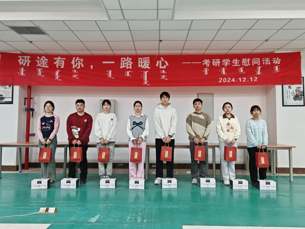為緩解考研學(xué)子備考?jí)毫Γ奈杩佳惺繗猓?2月12日,教務(wù)處組織開(kāi)展“研途有你,一路暖心”考研學(xué)生慰問(wèn)活動(dòng),教務(wù)處副處長(zhǎng)額日德木圖代表學(xué)校為考研學(xué)生送去了考試必備的文具套裝和牛奶。