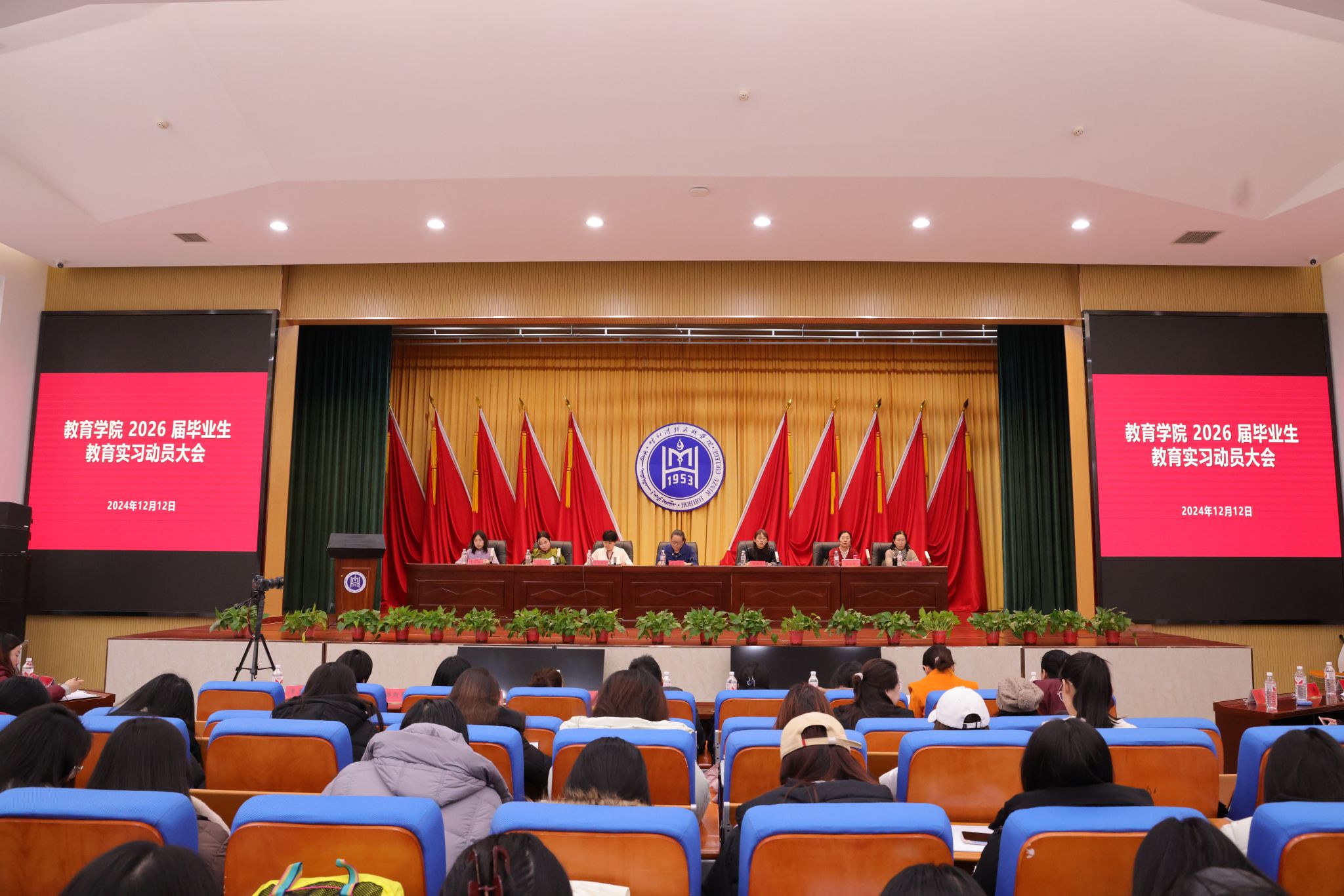 為穩步推進2026屆畢業生教育實習工作,12月12日,教育學院在學術報告廳召開2026屆畢業生教育實習動員大會。大會邀請教育學院實習基地——呼和浩特市貝爾路小學主校區副校長郭宇馨和呼和浩特市蒙古族幼兒園保教主任滿柱爾出席并進行實習指導。教育學院黨總支書記崔鳳珍、副院長其其格和全體教師、2026屆畢業生與會。副院長朱烏英嘎主持。