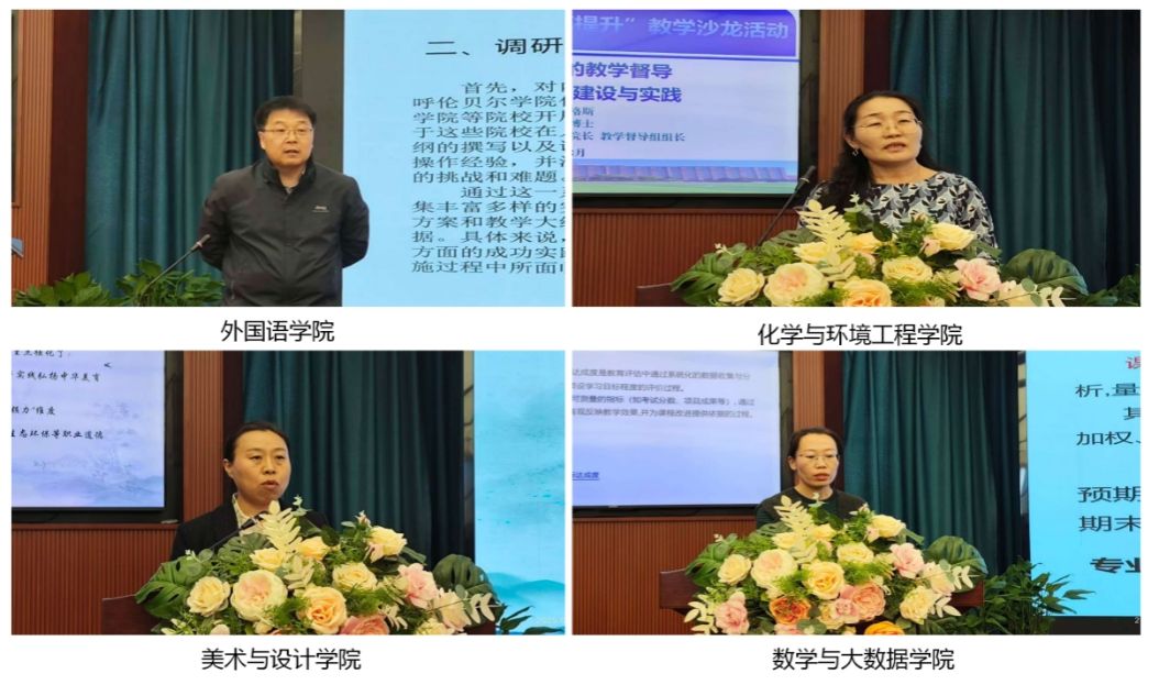 活動中,外國語學院院長秦紅喜以“聚焦人才培養:教學大綱與課程達成撰寫實戰分享”為題,介紹了外國語學院在教學大綱、課程評價標準編制過程中總結出的經驗及課程達成分析報告撰寫的實操要點。化學與環境工程學院副院長烏仁陶格斯以“基于OBE理念的教學督導與質量保障體系建設與實踐交流”為題,闡述如何通過成果導向教育理念構建督導機制,實現教學質量閉環管理。美術與設計學院副院長塔娜以“四維鑄魂·五方共育—美術與設計學院實踐教學思政育人共同體的探索與實踐”為題,展示了學院通過校企協同、文化浸潤等多路徑構建實踐教學思政育人共同體的創新成果。數學與大數據學院教師敖民以“課程目標達成度計算工作分享”為題,用數據驅動視角演示了課程評價的科學化流程與工具應用。
