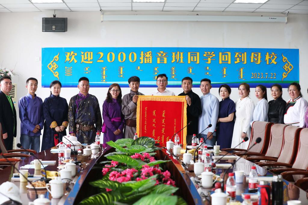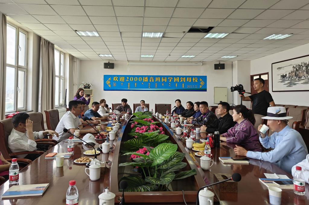 新聞傳媒學院2000級播音與主持藝術班畢業20周年,7月22日,校友榮歸母校,在綜合樓11層會議室與曾時師友進行了一次難忘的座談交流。曾任新聞傳媒學院教師,現學報編輯部主任旺·巴圖吉日嘎拉、管理學院院長哈斯通力嘎及退休教師莫·照日格圖、通拉嘎老師參會。座談會由學院院長額爾敦畢力格主持。
