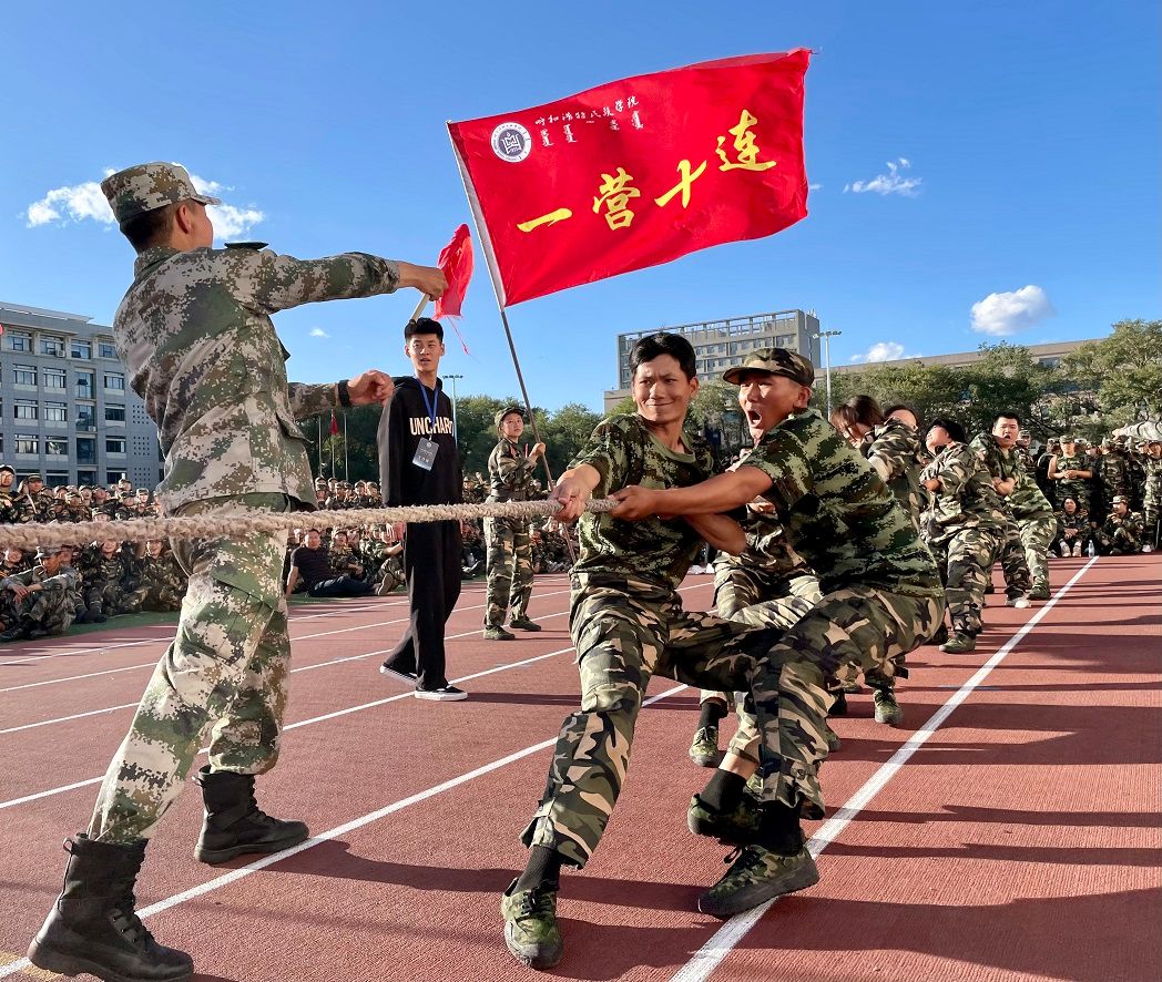 9月19日,呼和浩特民族學院2023級新生軍訓拔河比賽在學校南操場火熱展開。學生工作部全體人員,各二級學院輔導員均來到比賽現場,為同學們擂鼓吶喊助威。