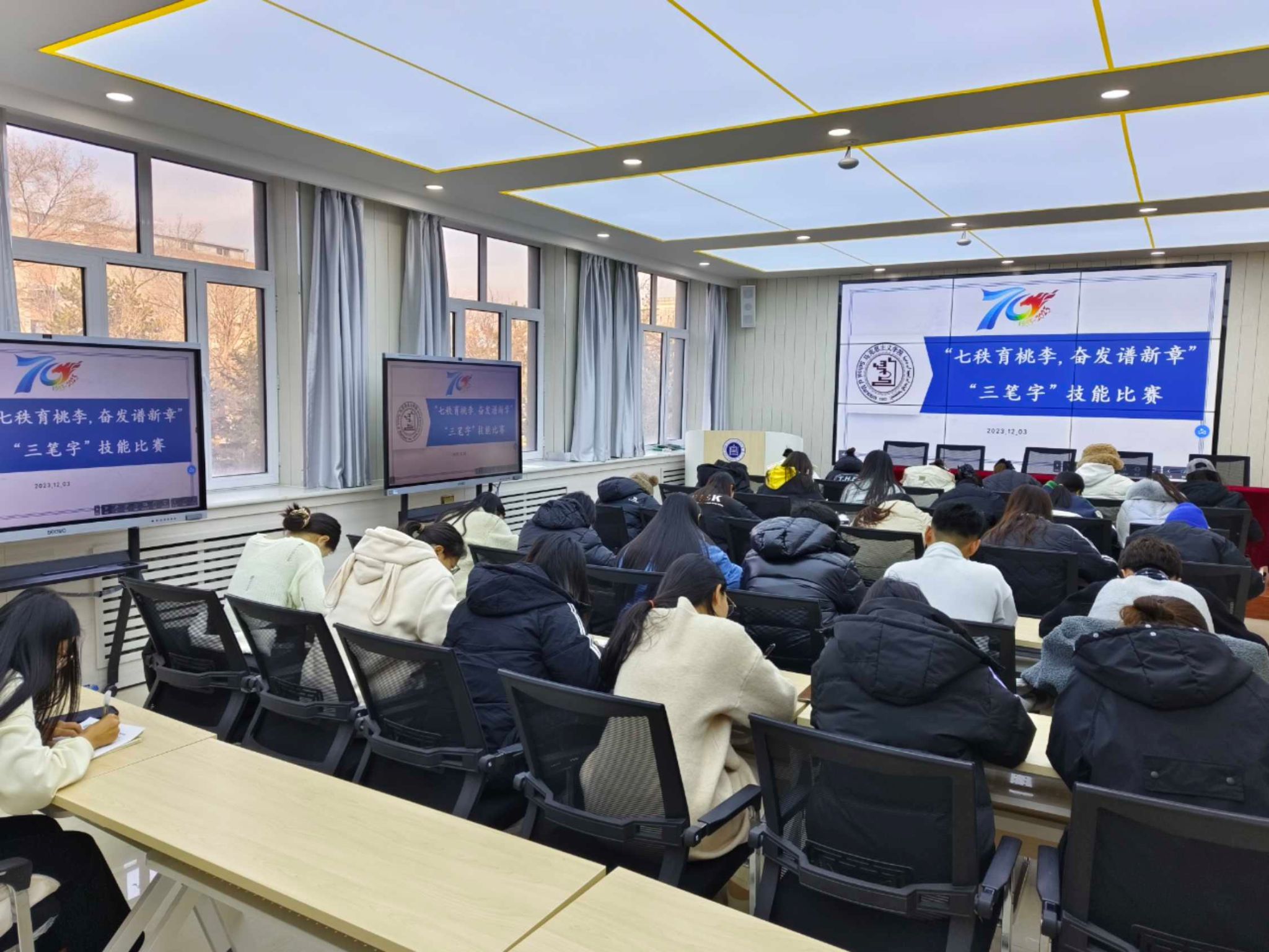 時光荏苒,歲月如歌。2023年,我校迎來建校70周年華誕。為深入學習貫徹習近平新時代中國特色社會主義思想和黨的二十大精神,激勵學院廣大師范生以更加昂揚的精神錘煉師范技能,勇擔重任,為實現建設特色鮮明的區域高水平應用型民族院校的目標努力奮斗。12月5日,馬克思主義學院思想政治教育教研室于崇正樓209智慧教室舉辦“七秩育桃李,奮發譜新章”三筆一畫技能大賽。