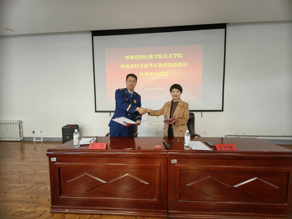 本次消防安全宣教活動共有三項內(nèi)容。首先,美術學院與呼和浩特市新華東街消防救援站在美術樓四樓多媒體教室簽訂了黨建共建合作協(xié)議。雙方表示將發(fā)揮各自優(yōu)勢,形成資源互補,聯(lián)合開展特色黨日活動、民族團結(jié)進步、志愿服務和消防安全教育等實踐活動,不斷凝聚黨組織戰(zhàn)斗堡壘作用,有效增強雙方的實踐能力和協(xié)作精神,共同推進鑄牢中華民族共同體意識教育,全力守護平安、和諧、美麗的校園環(huán)境。