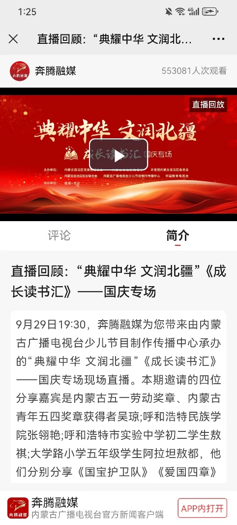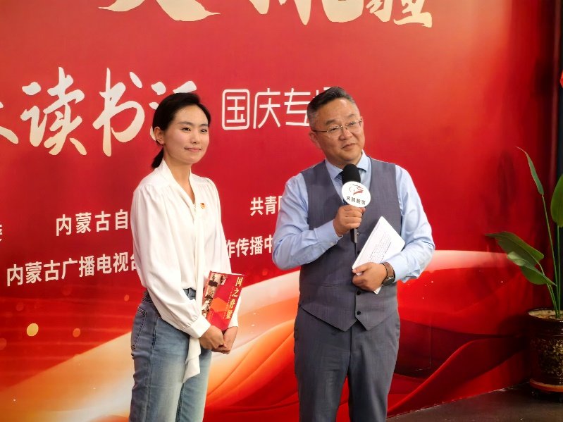 9月29日,我校二十余名師生代表參加了由內蒙古教育廳、內蒙古電視臺等單位主辦的“典耀中華 文潤北疆”成長讀書匯國慶專場活動,我校張翎艷等7名同學作為分嘉賓共同為觀眾分享讀書心得,并集體進行朗誦表演,充分展現了我校青年學子積極向上的精神風貌。節目在奔騰融媒、中國教育臺網絡電視臺等10個平臺同步直播,共獲得55萬次的播放量。