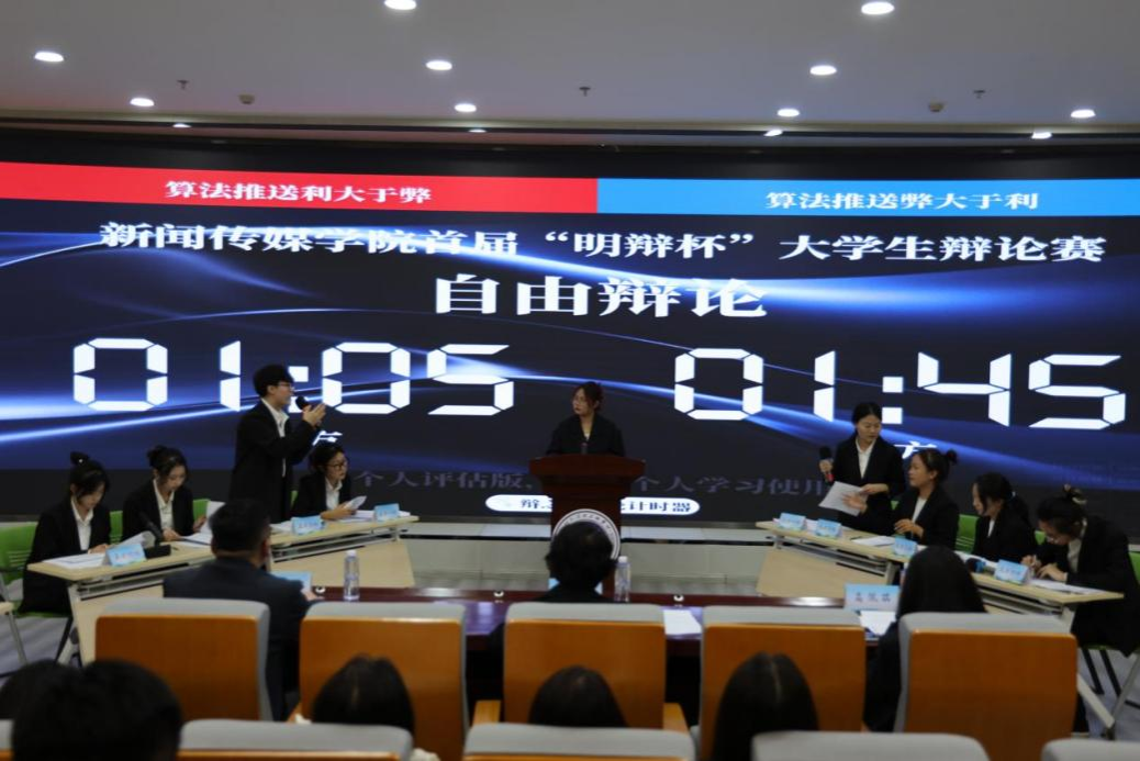 本次比賽由2022級網絡與新媒體班和2023級網絡與新媒體班的16名學生組成四支參賽隊伍,兩兩對戰,圍繞“算法推送利大于弊/弊大于利”展開辯論,比賽分為開篇立論、質詢立論、對辯盤問、自由辯論和結辯五個環節。辯手們以充分的論據和縝密的思路論證各自的觀點,精彩的表現贏得現場觀眾陣陣掌聲。
