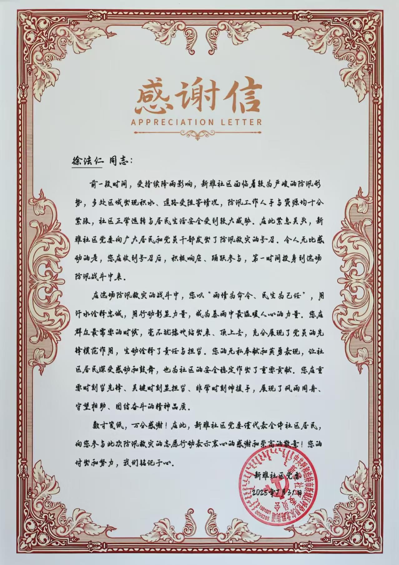 7月25日、26日,受強(qiáng)降雨影響,呼和浩特市區(qū)多處區(qū)域出現(xiàn)積水、道路受阻等情況,部分社區(qū)居民生活安全受到較大威脅。汛情就是命令,徐法仁同志第一時(shí)間響應(yīng)社區(qū)緊急招募志愿者通知,冒著仍未停止的大雨迅速趕到現(xiàn)場(chǎng),投身當(dāng)?shù)胤姥垂ぷ鳎瑸樯鐓^(qū)防洪抗災(zāi)和安全穩(wěn)定做出了突出貢獻(xiàn),展現(xiàn)出一名黨員干部高度的社會(huì)責(zé)任感和無(wú)私的奉獻(xiàn)精神。