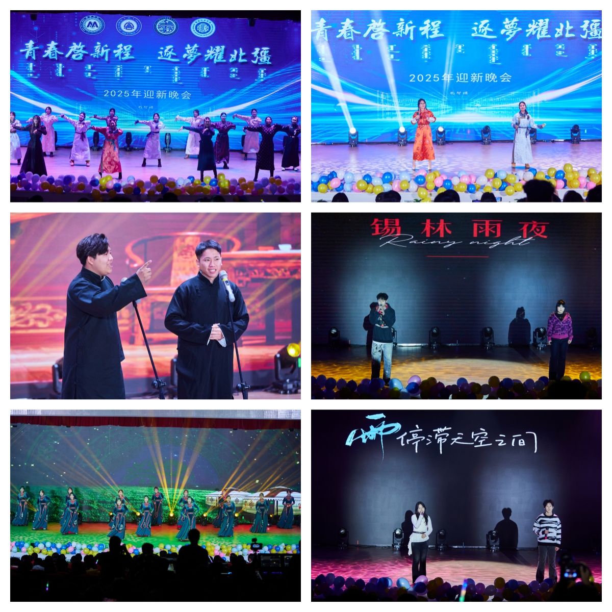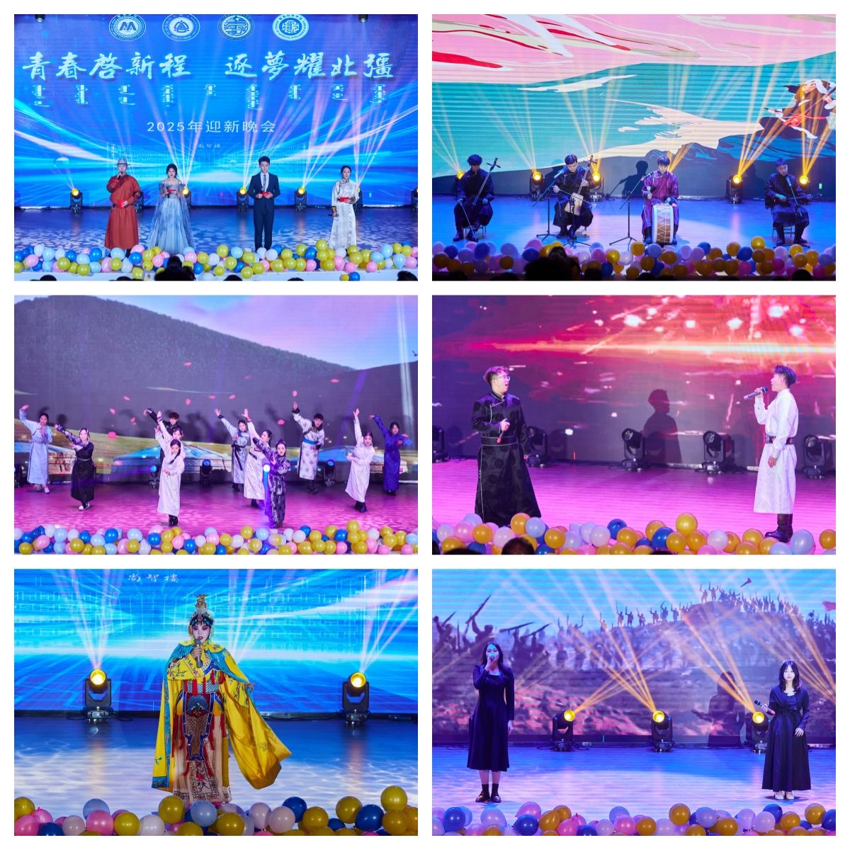 晚會以呼麥、馬頭琴《快語》和民族舞《草原晨牧》拉開帷幕。隨后節目輪番登場,京劇《霸王別姬》的水袖翩躚,讓新生領略傳統文化的雅致;相聲《聽學長說》以幽默口吻拆解校園生活“通關秘籍”,引得全場捧腹;樂隊演繹的《斑馬 斑馬》、歌伴舞《萬麗》則將青春張力拉滿,蒙語歌曲的婉轉旋律與民族舞《宴歌》的歡快舞步,更讓地域文化氣息浸潤每一處角落。