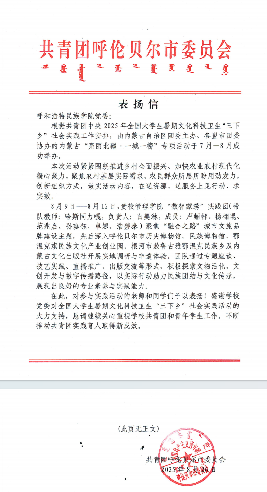 近日,我校管理學院“數智蒙繡”大學生社會實踐團收到共青團呼倫貝爾市委員會發來的表揚信,信中對我校師生在2025年全國大學生暑期“三下鄉”社會實踐——內蒙古“亮麗北疆·一城一榜”專項活動中的表現給予高度肯定和贊揚。