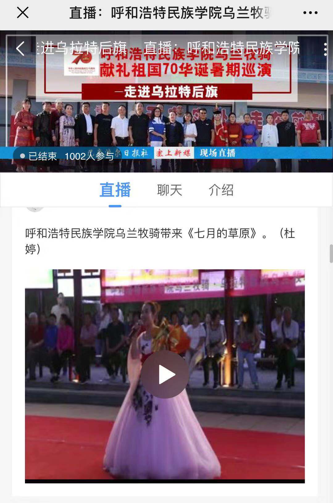 本次巡演以習近平總書記給烏蘭牧騎隊員回信和重要指示精神為指導,扎根沃土,服務群眾,將七場接地氣、群眾喜聞樂見的文藝演出送到了田間地頭、車間廠房、駐軍部隊和社區群眾身邊,得到了媒體的廣泛關注。人民網、內蒙古電視臺蒙漢文頻道、內蒙古融媒體、中國新聞網(含公眾號)、呼和浩特新聞網、北疆大學生公眾號、內蒙古旅游報、巴彥淖爾市電視臺等10余家新聞媒體進行了報道和直播,進一步向社會展現了我校烏蘭牧騎的風采。