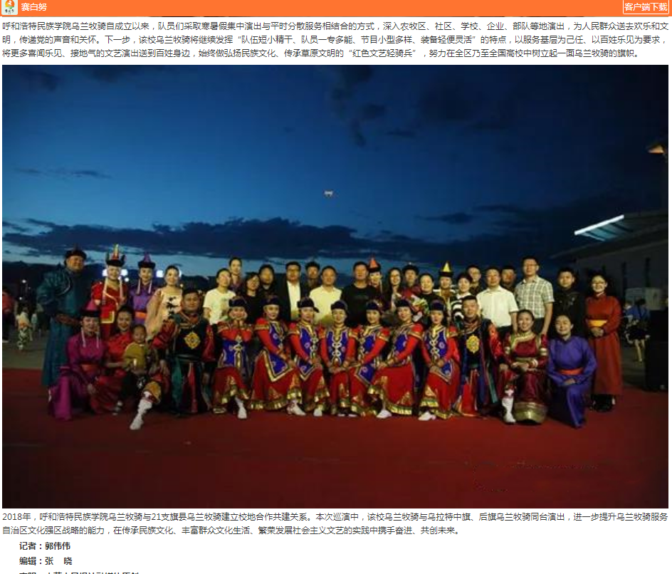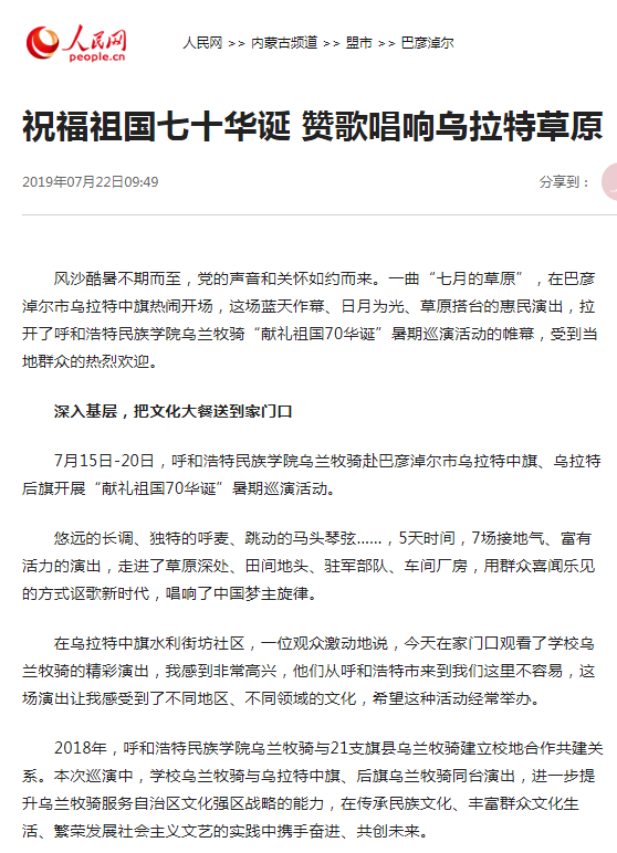 7月15日——20日,我校烏蘭牧騎赴巴彥淖爾深入農村、牧區、企業、軍營、社區,開展“獻禮祖國70華誕”暑期巡演活動。