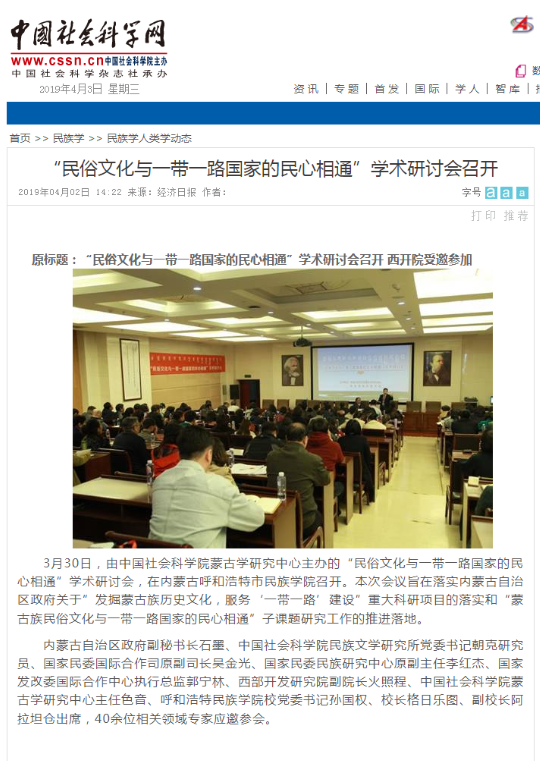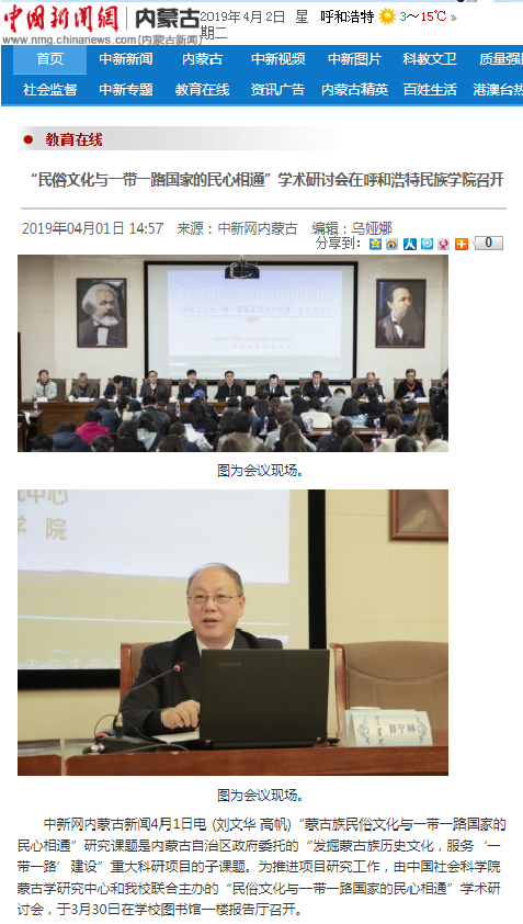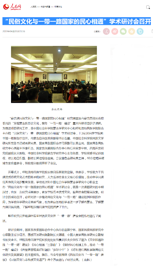 3月30日,“民俗文化與一帶一路國(guó)家的民心相通”學(xué)術(shù)研討會(huì)在我校召開。經(jīng)宣傳部積極與媒體取得聯(lián)系,人民網(wǎng)、中國(guó)新聞網(wǎng)、新華網(wǎng)、《民族畫報(bào)》、中國(guó)社會(huì)科學(xué)網(wǎng)、內(nèi)蒙古蒙古語(yǔ)衛(wèi)視、內(nèi)蒙古旅游報(bào)微信公眾號(hào)等媒體進(jìn)行了報(bào)道,取得了社會(huì)各界的廣泛好評(píng)和關(guān)注。
