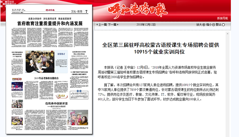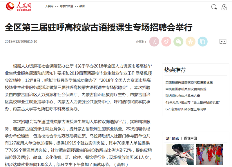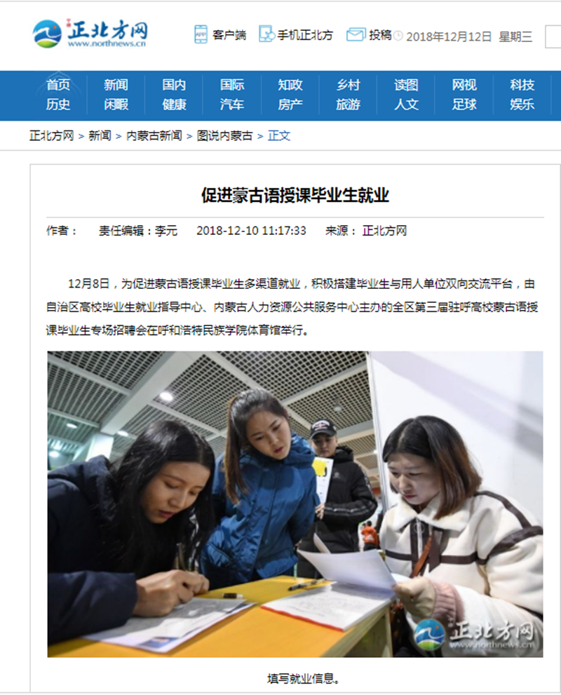 12月8日,第三屆駐呼高校蒙古語授課生專場招聘會在我校舉行。連日來,《北方新報》、《呼和浩特日報》、人民網(wǎng)、新華網(wǎng)(蒙文)、內(nèi)蒙古客戶端、中國新聞網(wǎng)、北疆大學(xué)生等主流媒體對活動進(jìn)行了跟蹤報道。新浪網(wǎng)、澎湃網(wǎng)、內(nèi)蒙古法制網(wǎng)等6家媒體進(jìn)行了轉(zhuǎn)載報道。通過媒體的廣泛關(guān)注,進(jìn)一步擴(kuò)大了我校的知名度、美譽(yù)度,有力地推進(jìn)了蒙古語授課畢業(yè)生就業(yè)擇業(yè)工作。