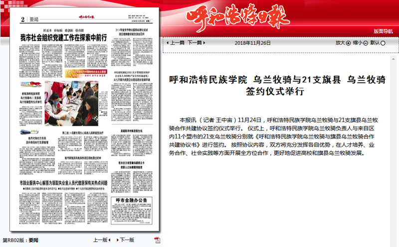 11月24日,我校烏蘭牧騎與21家旗縣烏蘭牧騎舉行舉行簽字儀式,并就下一步合作共建進(jìn)行交流座談。連日來(lái),內(nèi)蒙古廣播電視臺(tái)、呼和浩特廣播電視臺(tái)、《內(nèi)蒙古日?qǐng)?bào)》(蒙漢文版)、《北方新報(bào)》、《呼和浩特日?qǐng)?bào)》、《呼和浩特晚報(bào)》、新華網(wǎng)、中國(guó)新聞網(wǎng)、呼和浩特新聞網(wǎng)、呼和浩特廣播電臺(tái)等12家自治區(qū)主流媒體對(duì)活動(dòng)進(jìn)行了報(bào)道,內(nèi)蒙古新聞網(wǎng)、新浪網(wǎng)等8家媒體進(jìn)行了轉(zhuǎn)載報(bào)道。通過(guò)媒體的廣泛關(guān)注,進(jìn)一步展示我校烏蘭牧騎隊(duì)伍的風(fēng)采,提高了我校烏蘭牧騎的影響力。