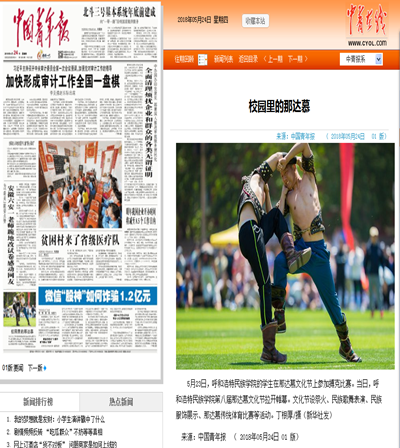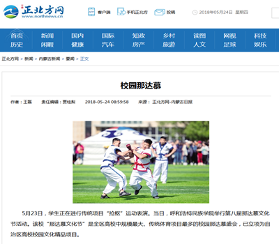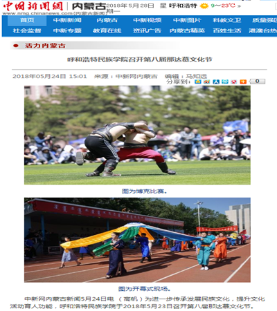 經學校黨委宣傳部的大力推廣和團委、網絡中心、保衛處、后勤管理處、體育系等部門的協助,本次那達慕文化節的媒體宣傳工作實現了歷史性突破。截止到5月28日,共有30家新聞媒體進行了專題報道,媒體覆蓋廣度和宣傳報道力度是建校以來之最。其中,《中國日報》(英文名稱《China Daily》,全球發行,期均90余萬份)在顯要位置以圖片新聞報道;《中國青年報》《內蒙古日報》(蒙古語、漢語版)《呼和浩特日報》《北方新報》《呼和浩特晚報》《內蒙古晨報》7家報紙媒體進行了頭版報道,《內蒙古日報》(蒙古語版)整版報道;內蒙古衛視2個電視頻道,新華社、人民網、光明網、新華網、中國新聞網等11家網站,中央人民廣播電臺、中國蒙古語廣播電臺、內蒙古廣播電臺蒙古語頻道、呼和浩特新聞廣播等3家電臺,影像內蒙古、北疆大學生、內蒙古客戶端、內蒙古日報等4家主流微信公眾號進了報道;新浪網、網易網、中國民族宗教網、《山西日報》等僅百余網站、媒體進行了轉載報道。