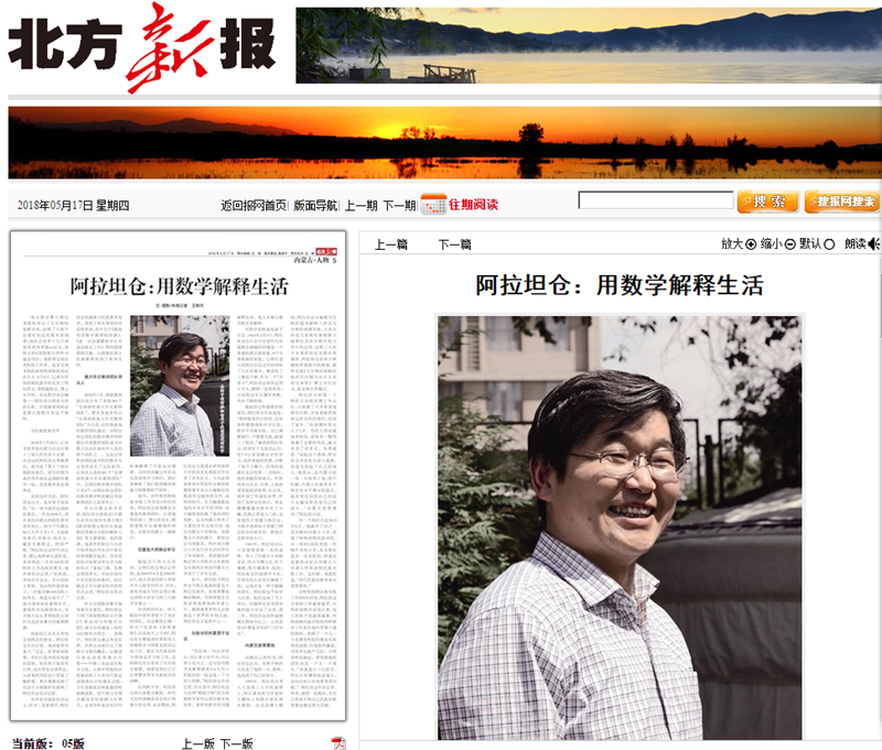 2018年5月17日,《北方新報(bào)》刊發(fā)題為《阿拉坦倉:用數(shù)學(xué)解釋生活》的整版報(bào)道。該文講述了阿拉坦倉副院長在霍金身邊的求學(xué)經(jīng)歷,介紹了他作為全國政協(xié)委員和黃大年式教師團(tuán)隊(duì)帶頭人,對發(fā)展民族教育和數(shù)學(xué)研究事業(yè)所做出的努力,贊譽(yù)了阿副院長心懷感恩、回報(bào)家鄉(xiāng)之情。