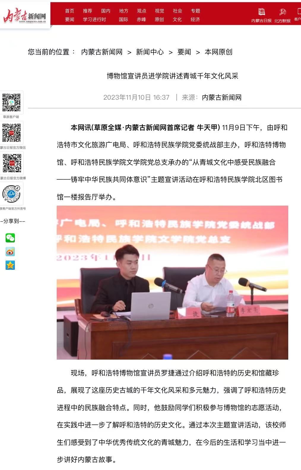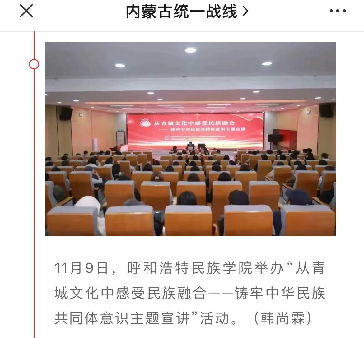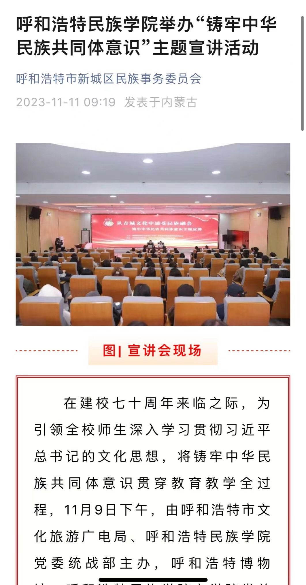 11月9日下午,由呼和浩特市文化旅游廣電局、呼和浩特民族學院黨委統戰部主辦,呼和浩特博物館、呼和浩特民族學院文學院黨總支承辦的主題宣講活動在北區圖書館一樓報告廳舉辦。活動受到社會各界的廣泛關注和大力宣傳。截至目前,共有中新網、內蒙古新聞網和內蒙古黨委統戰部官微、呼和浩特博物館官微、呼和浩特新城區民族事務委員會官微等6家校外媒體對本次活動進行了宣傳報道。