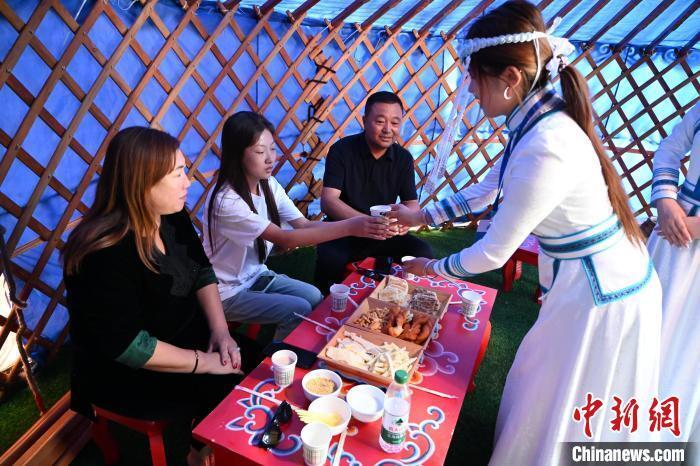 8月30日,內蒙古呼和浩特市,身著民族服裝的學生用蒙古族傳統美食招待新同學一家。中新社記者 劉文華 攝