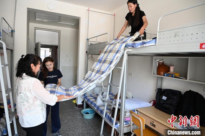 8月30日,內蒙古呼和浩特市,大學生與家長一起收拾被褥。中新社記者 劉文華 攝