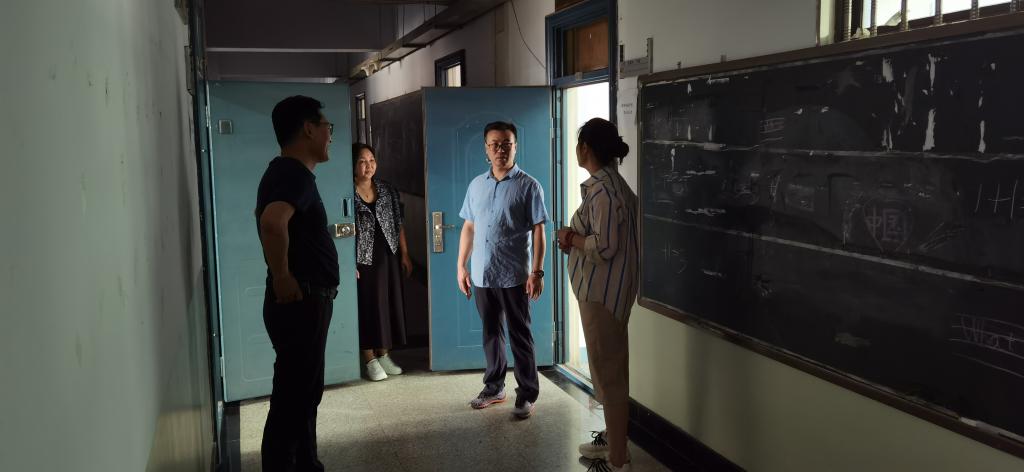 2022年8月21日上午,教務處額爾敦布和處長、佟繁榮副處長與教務處相關人員一同對開學前的教學準備工作進行了檢查。額爾敦布和處長先后檢查了崇正樓、尚智樓、都林樓、綜合樓等教學樓,并對教材發放、教室桌椅、投影設備、實驗室以及教室衛生進行了抽查。額爾敦布和處長指出,教學管理人員應該加強對教室、實驗室、公共機房、琴房、畫室等教學用房和多媒體設備的管理,積極與后勤管理處協調做好教室內消殺工作,確保新學期開學各項工作有序進行。隨后,額爾敦布和處長和佟繁榮副處長到二級學院檢查了開學前疫情防控與教學工作的準備情況。