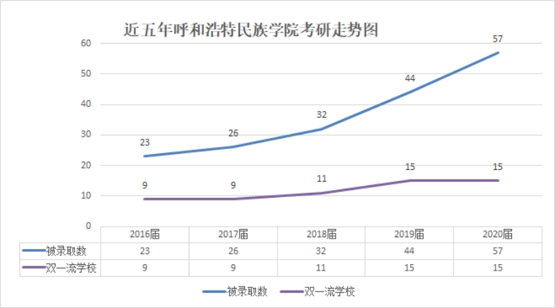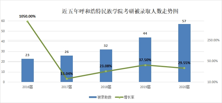 春種夢想,夏育成長,秋實可輟。呼和浩特民族學院2020屆本科畢業生共1790人,其中參加研究生考試人數為386人,報考率達21.56%,錄取率為3.18%,相比2016年增長146%。通過國家分數線的考生82人,占全部考生的話21.24%,考取碩士研究生57人,考研率為14.77%。