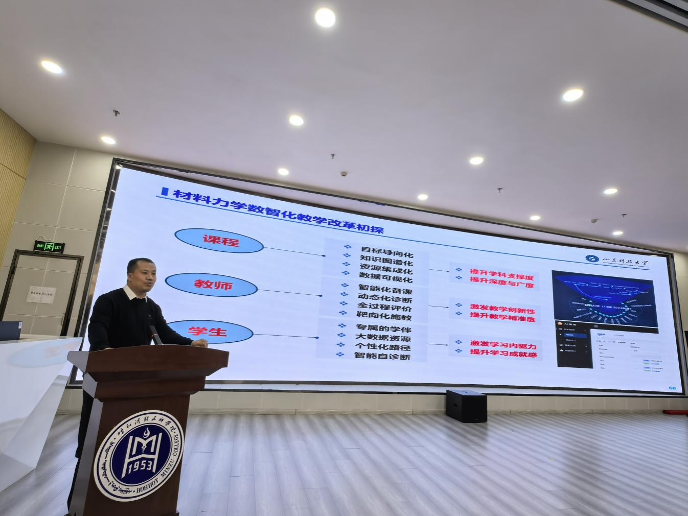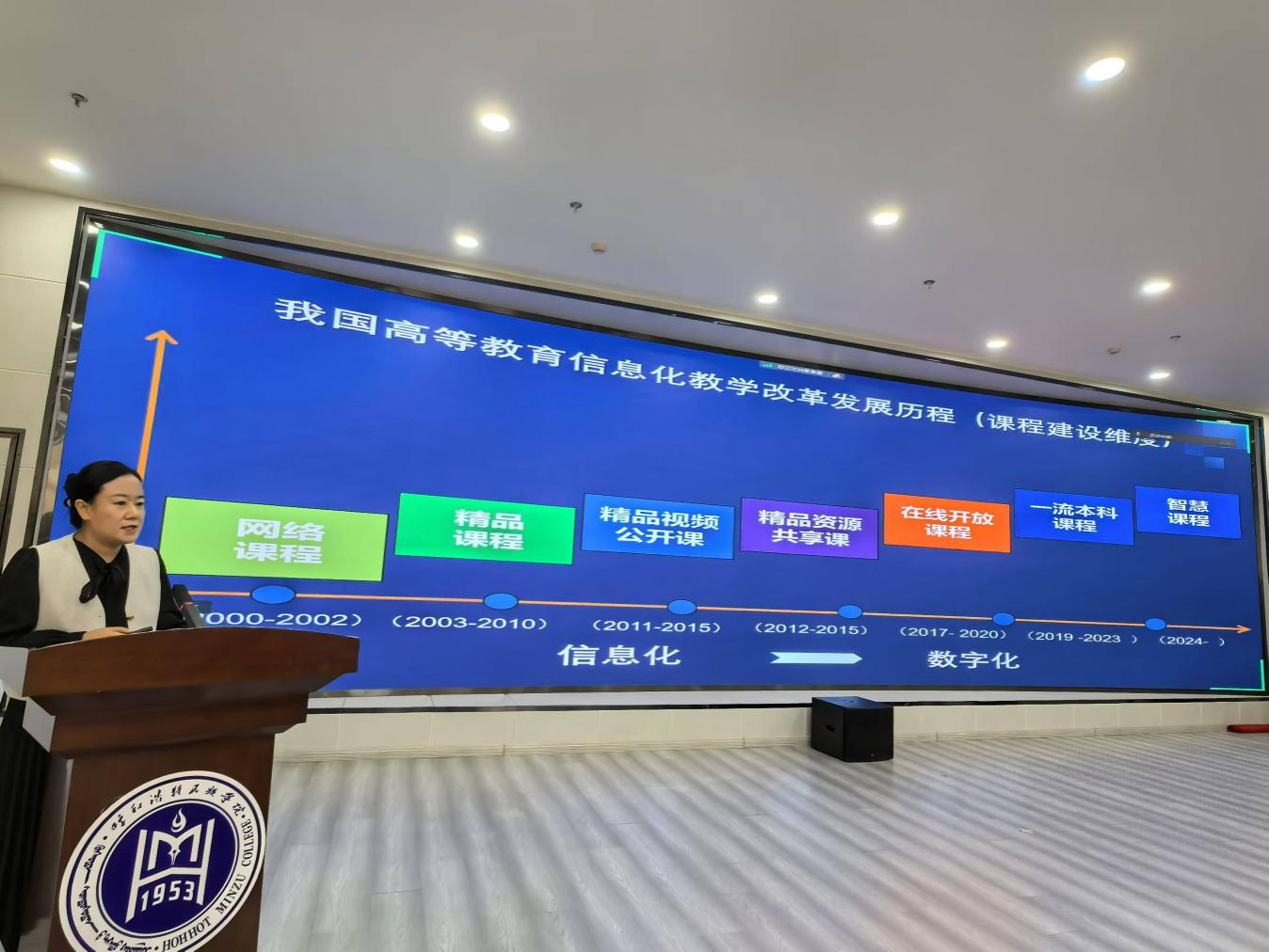 額爾敦布和在致辭中指出,教育數字化已經成為賦能高校課程資源建設的重要驅動力,他號召老師們一要響應國家教育數字化戰略行為,把握數字化機遇,充分利用大數據,信息技術應用場景,提高課程建設質量,全方位提高教學的創新性、高階性和挑戰性。二要響應教育教學智能化發展態勢,把握智能化機遇,充分利用知識圖譜、AI智慧場景,提升課程建設效益,全視角打造教學的新模式、新定位和新增量。