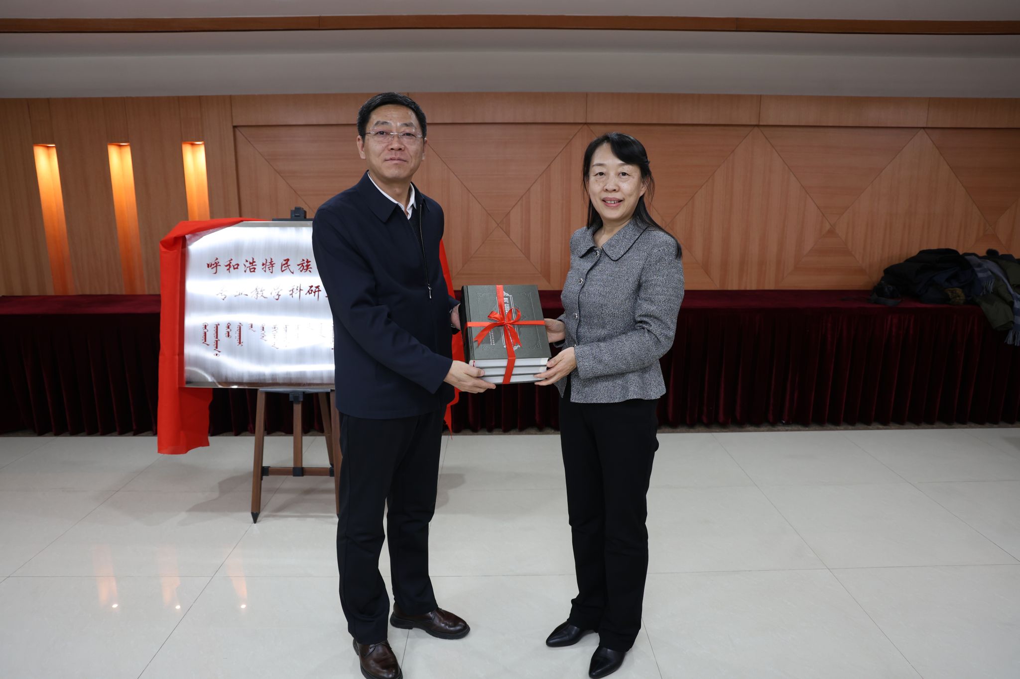 李曉梅向高喜天贈(zèng)送《清末、民國(guó)時(shí)期中、俄、蒙邊境邊防滿(mǎn)文檔案》書(shū)籍