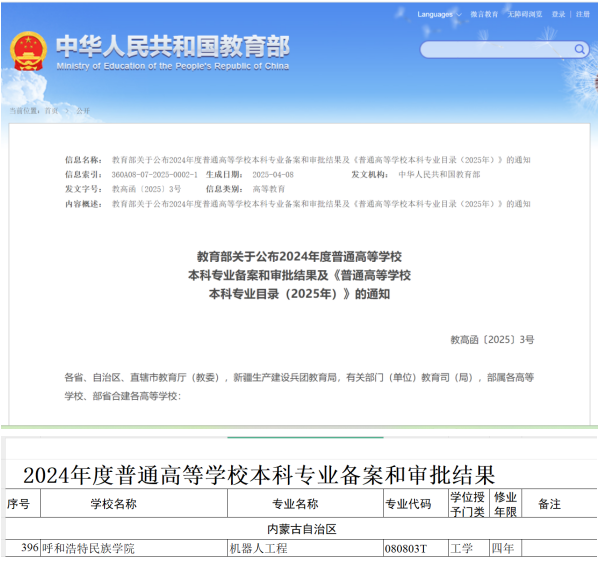 4月22日,教育部正式發布《關于公布2024年度普通高等學校本科專業備案和審批結果及〈普通高等學校本科專業目錄(2025年)〉的通知》(教高函〔2025〕3號),我校申報的“機器人工程”專業成功獲批。