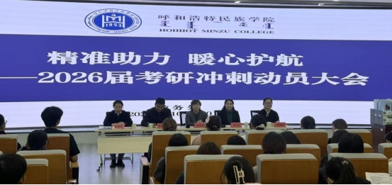 為進(jìn)一步鼓舞考研學(xué)子士氣,提供精準(zhǔn)高效的備考支持,10月20日晚,學(xué)校在鑄牢中華民族共同體意識(shí)教育館思想政治教育實(shí)踐教學(xué)基地舉辦“精準(zhǔn)助力 暖心護(hù)航”2026屆考研沖刺動(dòng)員大會(huì)。會(huì)議由教務(wù)處副處長(zhǎng)青格樂(lè)圖主持,2026屆考研班100余名學(xué)生參會(huì)。