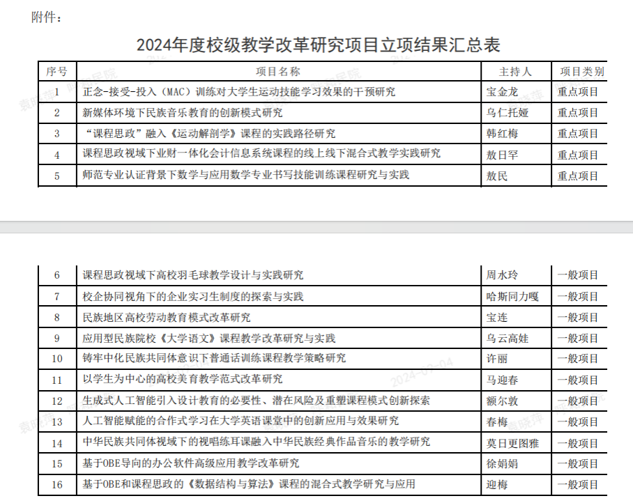 根據《關于開展2024年度呼和浩特民族學院教學改革研究項目申報立項與結項驗收工作的通知》(呼和民院教務〔2024〕41號)要求,經個人申報、學院(部門)推薦、教務處資格審核、學校教學指導委員會評審、公示無異議后遴選出“正念-接受-投入(MAC)訓練對大學生運動技能學習效果的干預研究”等16個項目立項(具體名單見附件)為呼和浩特民族學院2024年度校級教學改革項目,現對立項結果予以公布。