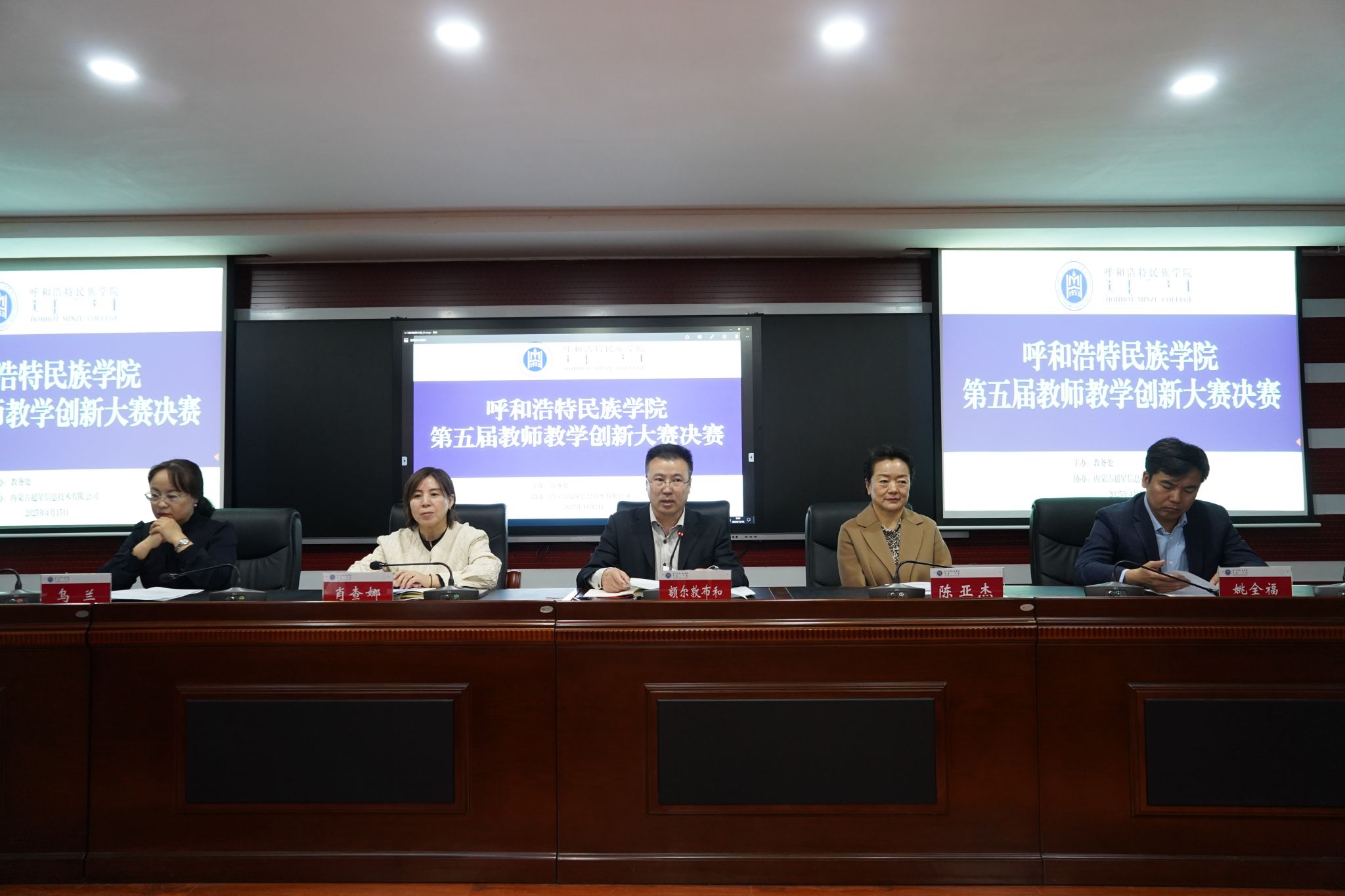 為深入學習貫徹全國教育大會精神,進一步推進教育強國、教育強區建設與高等教育高質量發展,落實立德樹人根本任務,大力弘揚教育家精神,助力我校課程思政建設和新工科、新文科建設,推動信息技術與教育教學創新發展,提高產教協同育人成效,提升教師教書育人能力和人才培養質量,打造我校教學改革的風向標,4月15日,學校在尚智樓413報告廳、623智慧教室舉辦了呼和浩特民族學院第五屆教師教學創新大賽決賽。本次比賽由教務處主辦,內蒙古超星信息技術有限公司協辦,校黨委委員、副校長額爾敦布和出席賽事并致辭,賽事活動由教務處處長肖查娜主持。