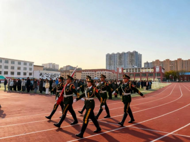 儀式現場,師生整齊列隊,莊嚴肅立。英姿颯爽的國旗護衛隊邁著鏗鏘步伐護送國旗入場。在雄壯的《義勇軍進行曲》中,鮮艷的五星紅旗冉冉升起,全體師生高唱國歌,向國旗行注目禮。
