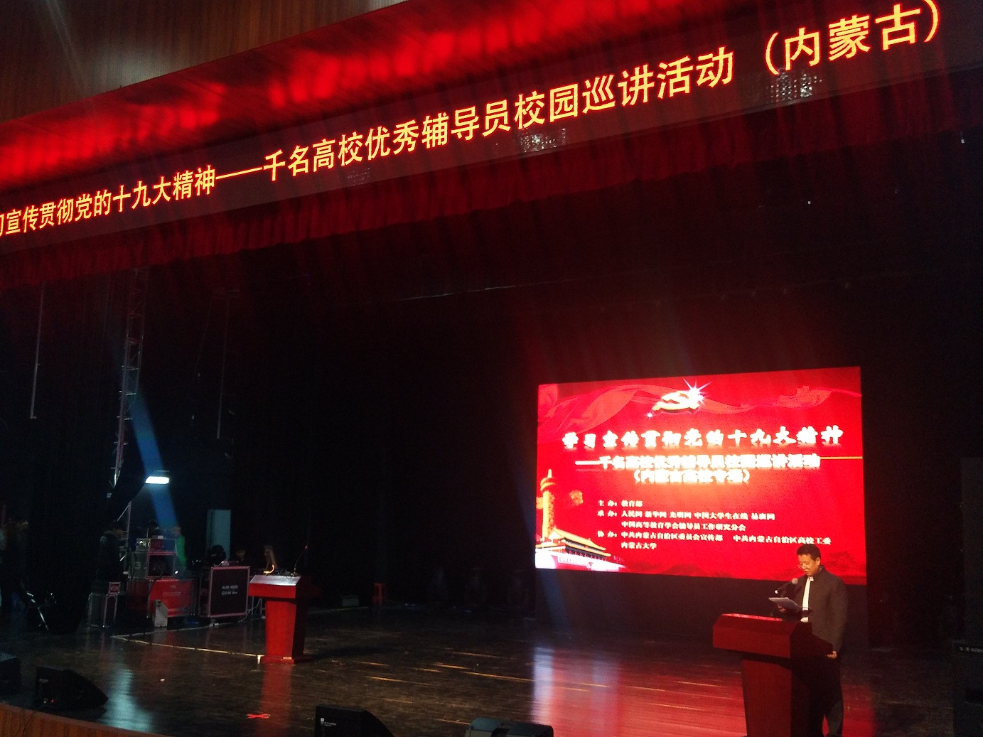 由教育部組織開展的“學(xué)習(xí)宣傳貫徹黨的十九大精神——千名高校優(yōu)秀輔導(dǎo)員‘校園巡講’和‘網(wǎng)絡(luò)巡禮’活動”之優(yōu)秀輔導(dǎo)員校園巡講團活動(內(nèi)蒙古)于11月26日上午在內(nèi)蒙古大學(xué)南校區(qū)隆重舉行,全區(qū)各高校學(xué)生工作處負責(zé)同志及優(yōu)秀輔導(dǎo)員代表出席本次巡講活動。我校派包倉、陳青春、孫玉波、齊丹、白淑華、根領(lǐng)、雙月等7名輔導(dǎo)員參加了此次活動。