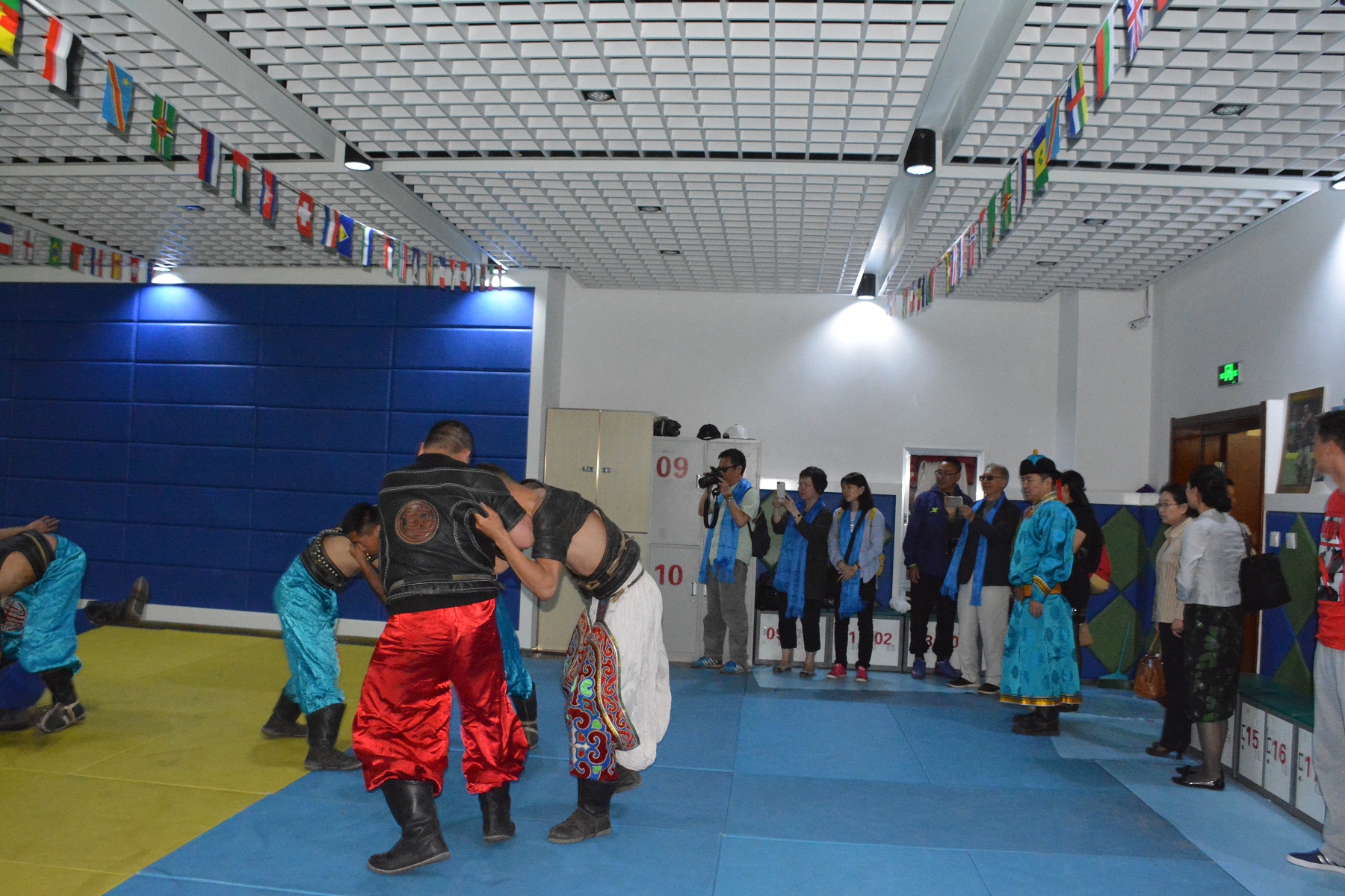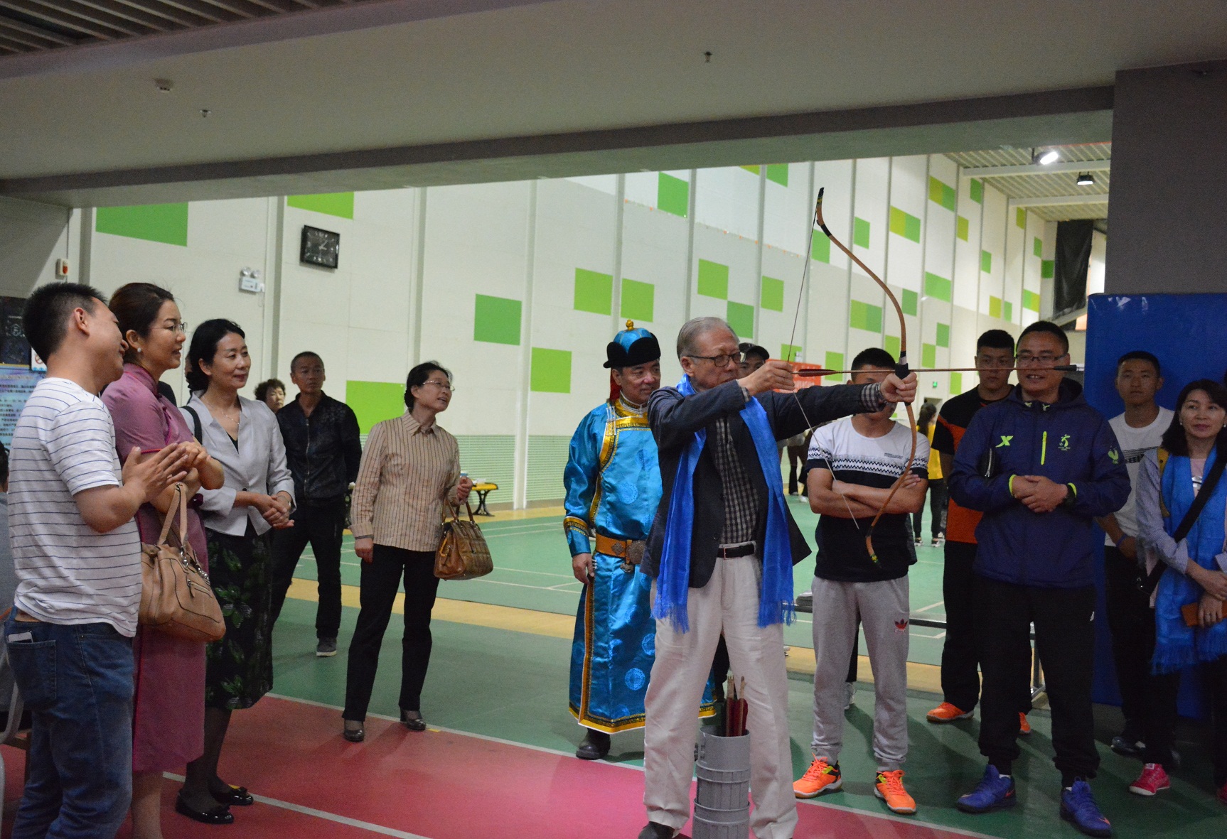 盧沃棠先生一行首先參觀了我校體育館,現場體驗及詳細了解了蒙古族“搏克”、“民族健身操”、“沙嘎游藝”、“沙嘎哈日靶”、“蒙古象棋”、“包根吉日格”、“傳統射箭”、“傳統布魯”等傳統教學項目。隨后,視察了校園及周邊環境,現場聽取了學校工作情況匯報,并就有關問題與校領導進行了交流。