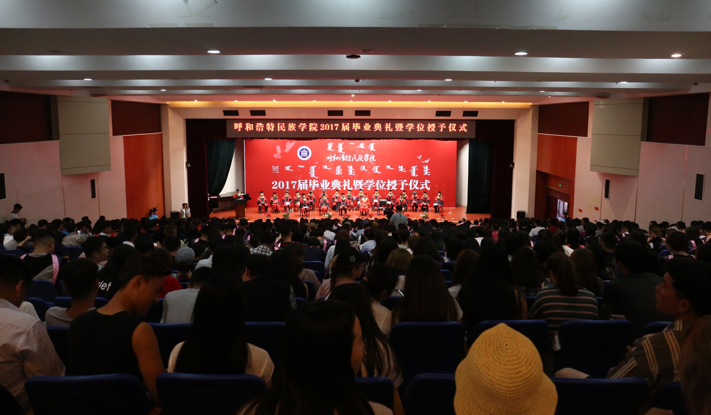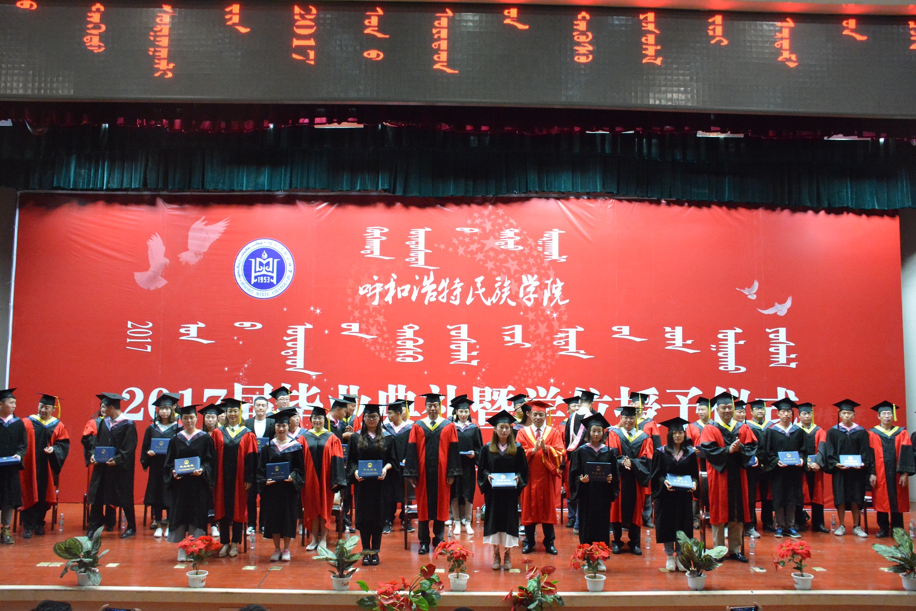 儀式上,教務處副處長胡畢斯哈拉圖宣讀了學校2017屆學生畢業情況;全體學校領導為2017屆畢業生頒發了畢業證書。學校學位委員會主任格日樂圖院長及主席臺領導為獲得學士學位的畢業生代表授予學位并行撥穗禮。主席臺上的每一位老師與畢業生握手祝賀、畢業快樂、撥穗行禮、合影留念,與同學們簡短交流,祝福同學們前程似錦。